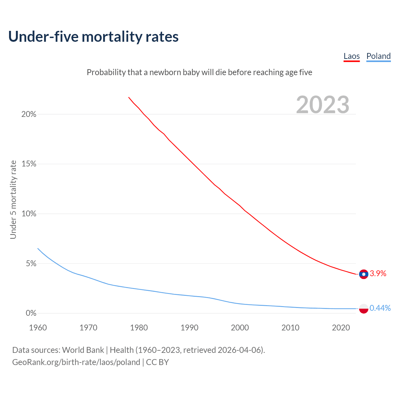 The chance that a newborn baby will die before reaching age five is 3.9% in Laos and 0.44% in Poland. Above is a chart with historical data on under-five mortality rates.