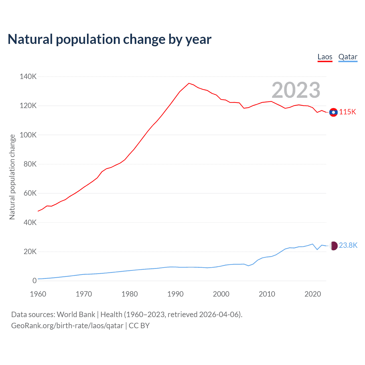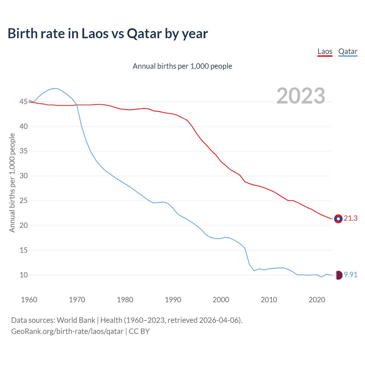 Laos has an annual birth rate of 21.3 births per 1,000 people, compared to 9.91 for Qatar. The average number of children a woman is expected to have during her lifetime — the fertility rate, is 2.42 in Laos and 1.73 in Qatar — 28.6% difference.