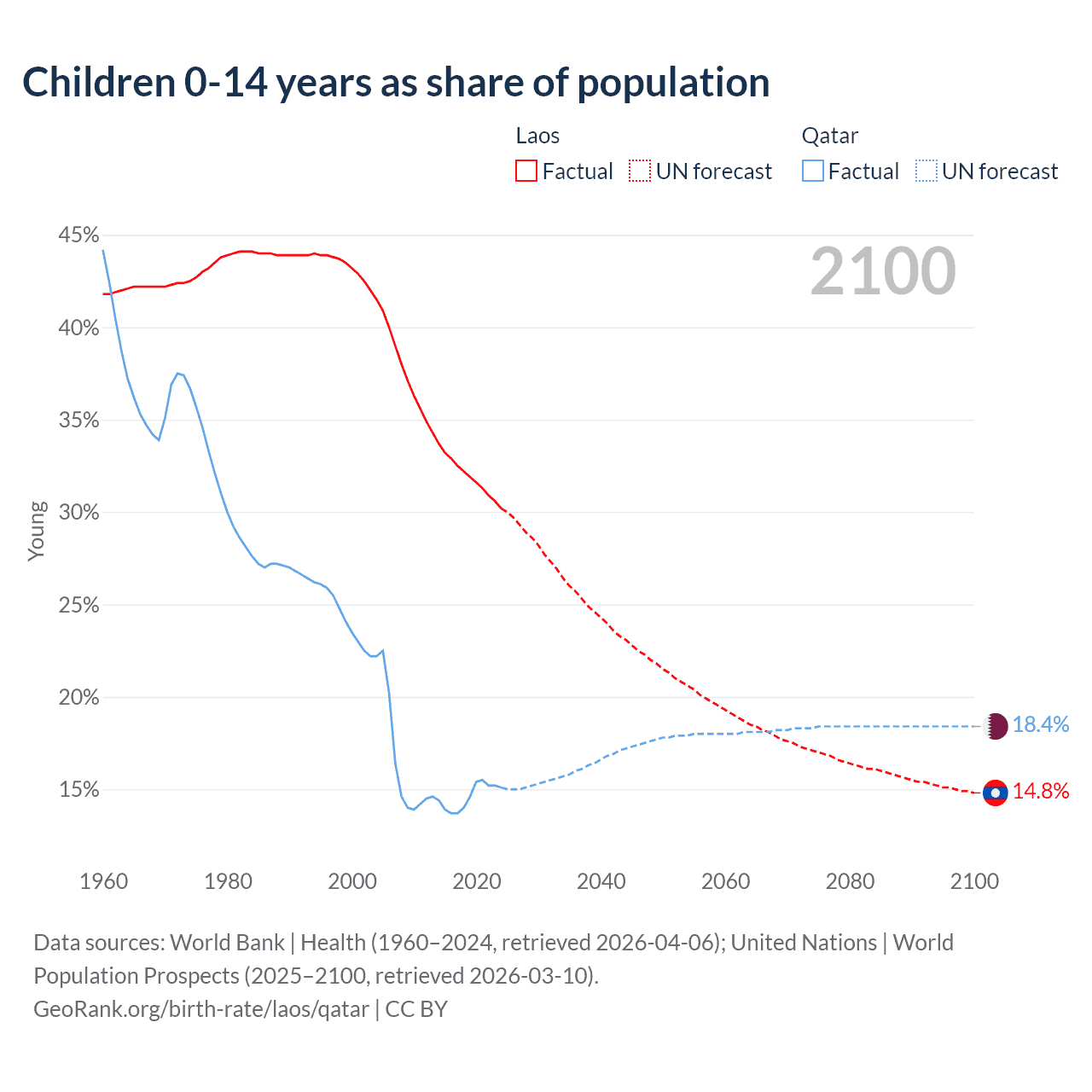 According to the latest available data on birth rates, the fertility rate in Laos was 2.42 children per woman in 2023, compared to 1.73 in Qatar in 2023. The replacement level is considered to be 2.1 children per woman.