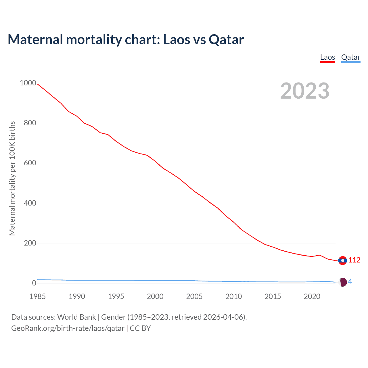 The maternal mortality rate, which is the probability of dying during childbirth or within 42 days of pregnancy termination, is 112 deaths per 100,000 live births in Laos, compared to 4 deaths in Qatar.