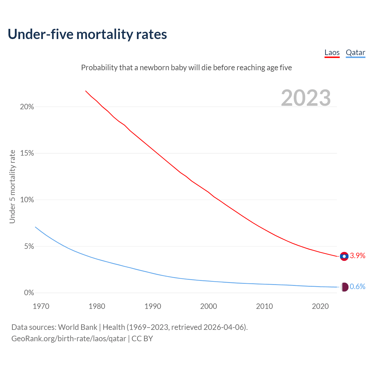 The chance that a newborn baby will die before reaching age five is 3.9% in Laos and 0.6% in Qatar. Above is a chart with historical data on under-five mortality rates.