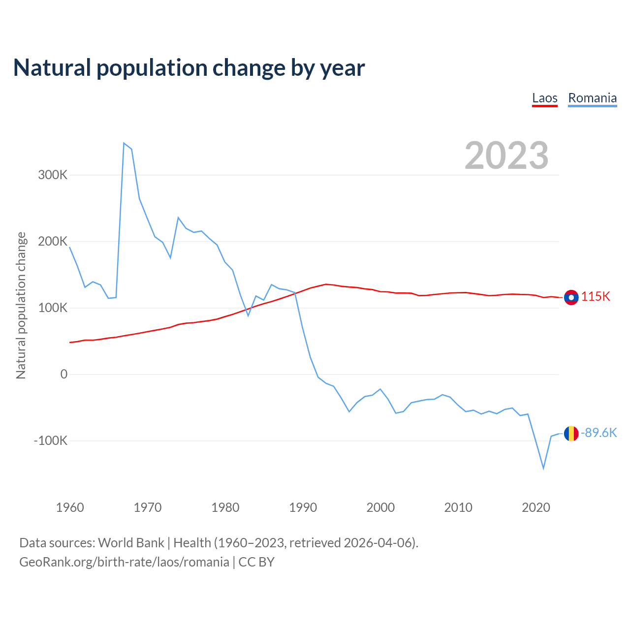 - Laos is ranked 65/196 by birth rate compared to 177/196 for Romania.