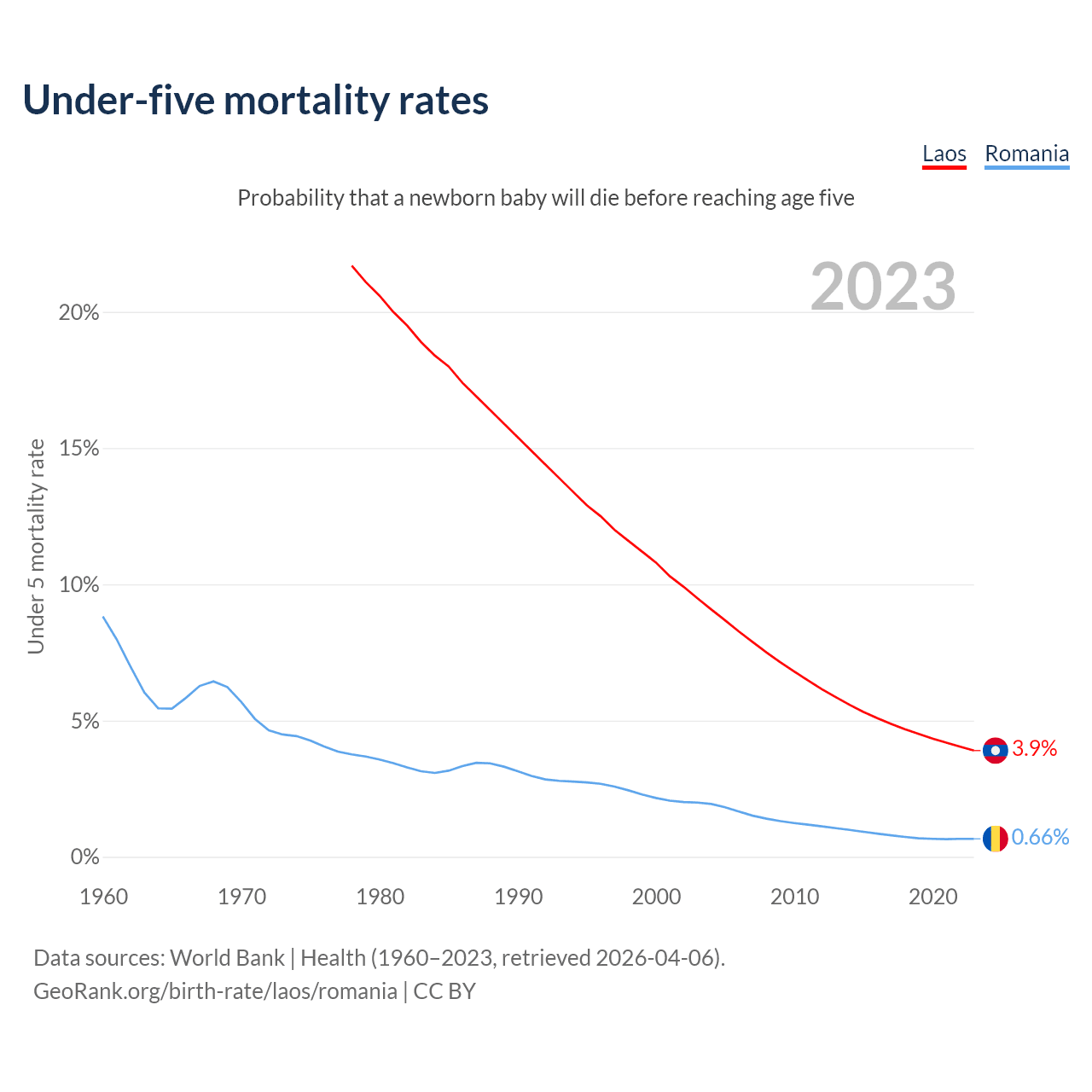 The chance that a newborn baby will die before reaching age five is 3.9% in Laos and 0.66% in Romania. Above is a chart with historical data on under-five mortality rates.