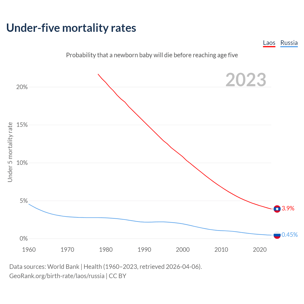 The chance that a newborn baby will die before reaching age five is 3.9% in Laos and 0.45% in Russia. Above is a chart with historical data on under-five mortality rates.