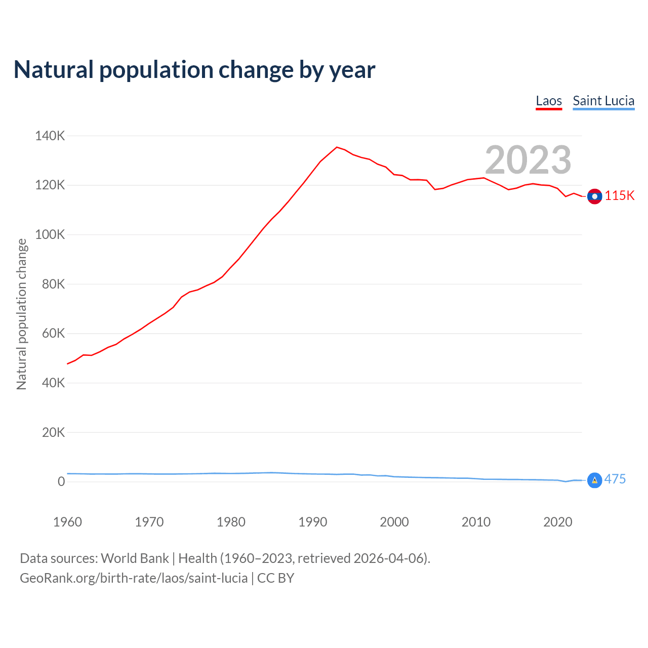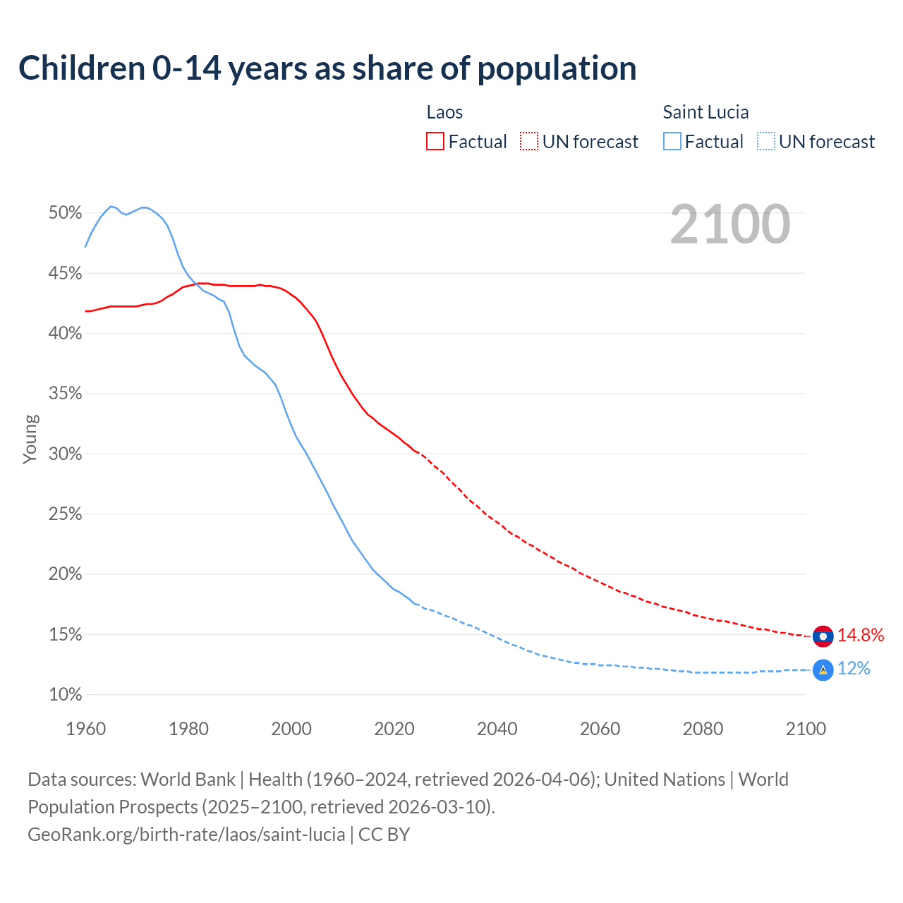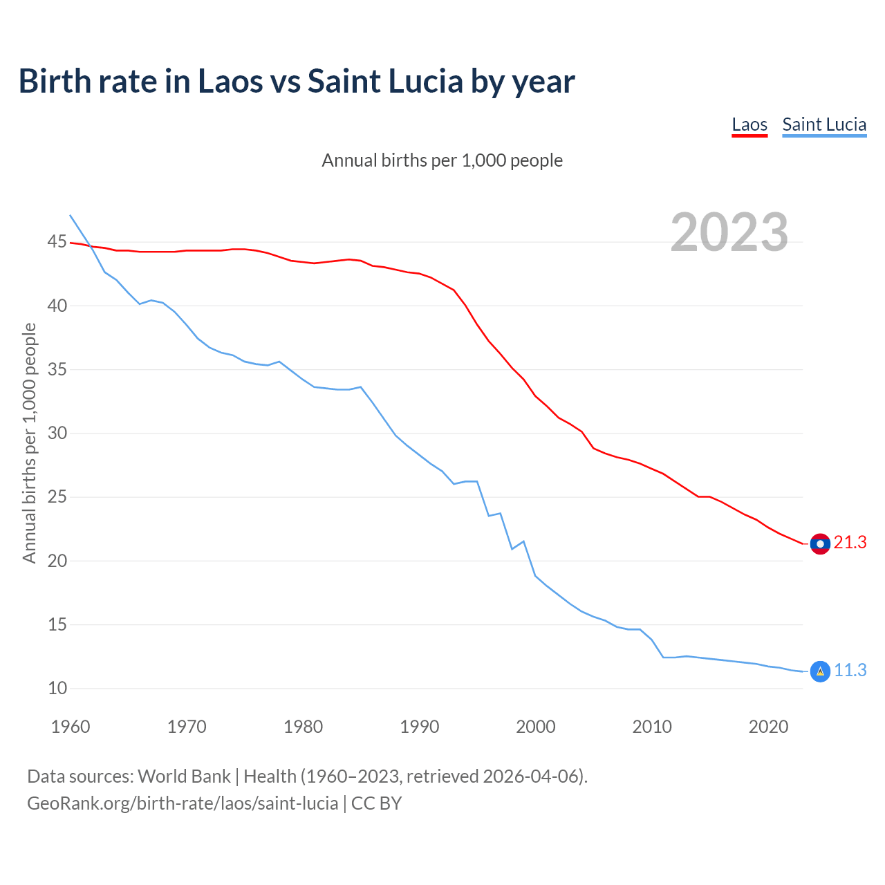 Laos has an annual birth rate of 21.3 births per 1,000 people, compared to 11.3 for Saint Lucia. The average number of children a woman is expected to have during her lifetime — the fertility rate, is 2.42 in Laos and 1.38 in Saint Lucia — 43% difference.