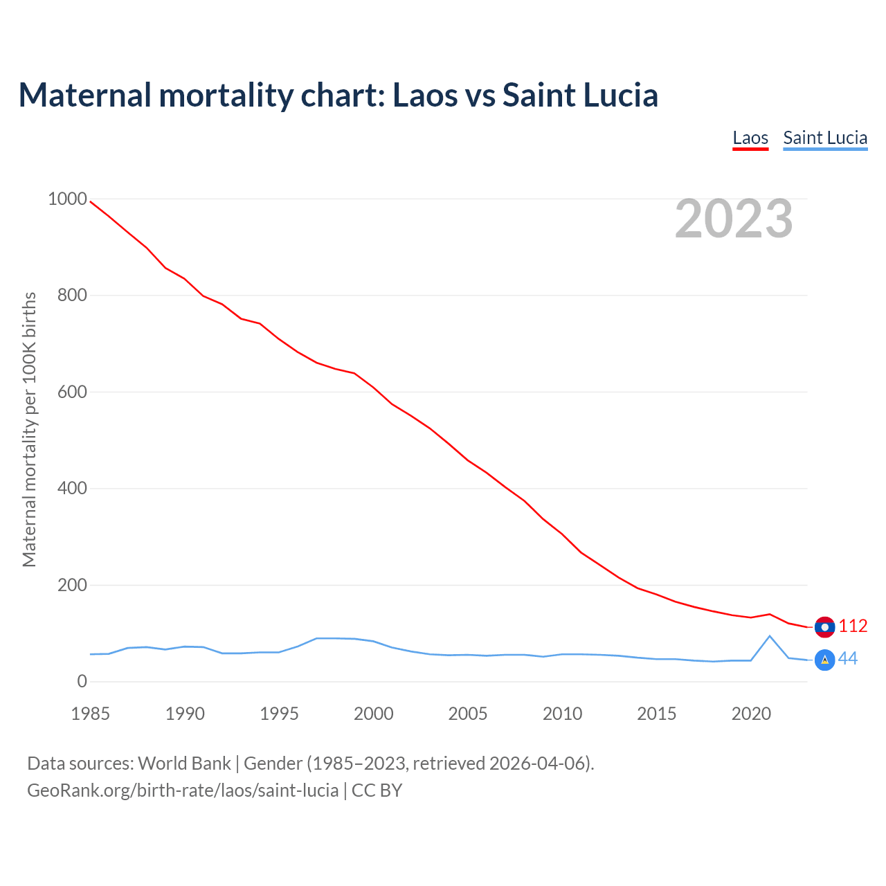 The maternal mortality rate, which is the probability of dying during childbirth or within 42 days of pregnancy termination, is 112 deaths per 100,000 live births in Laos, compared to 44 deaths in Saint Lucia.