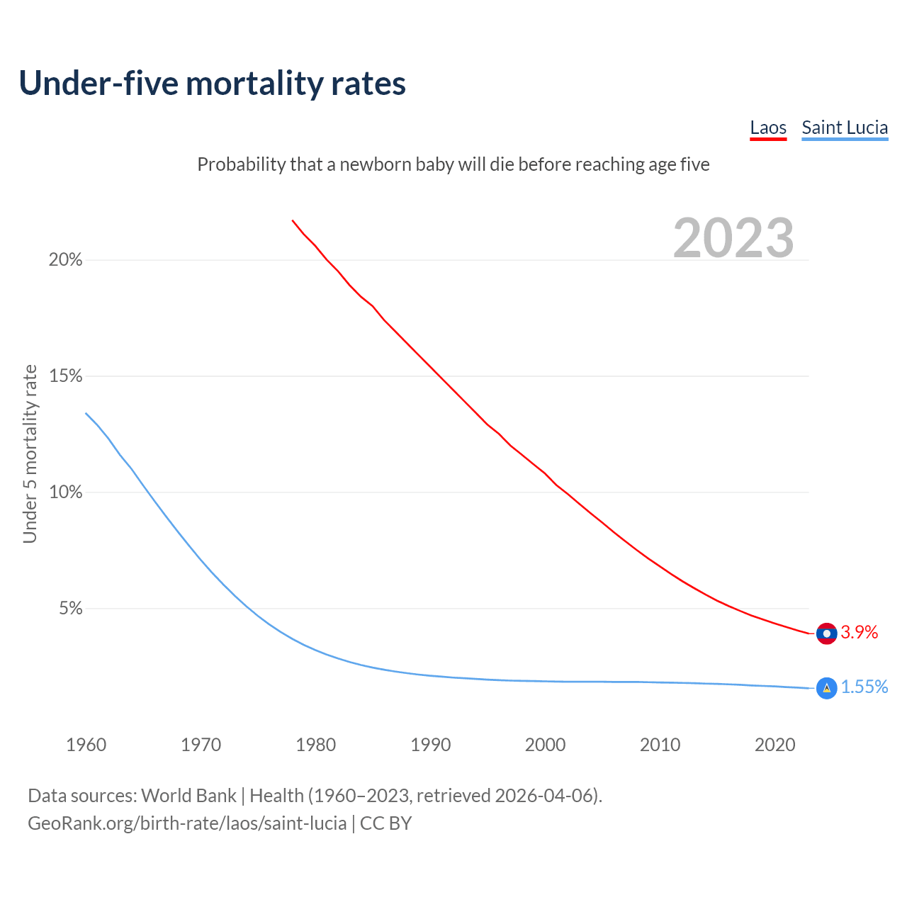 The chance that a newborn baby will die before reaching age five is 3.9% in Laos and 1.55% in Saint Lucia. Above is a chart with historical data on under-five mortality rates.