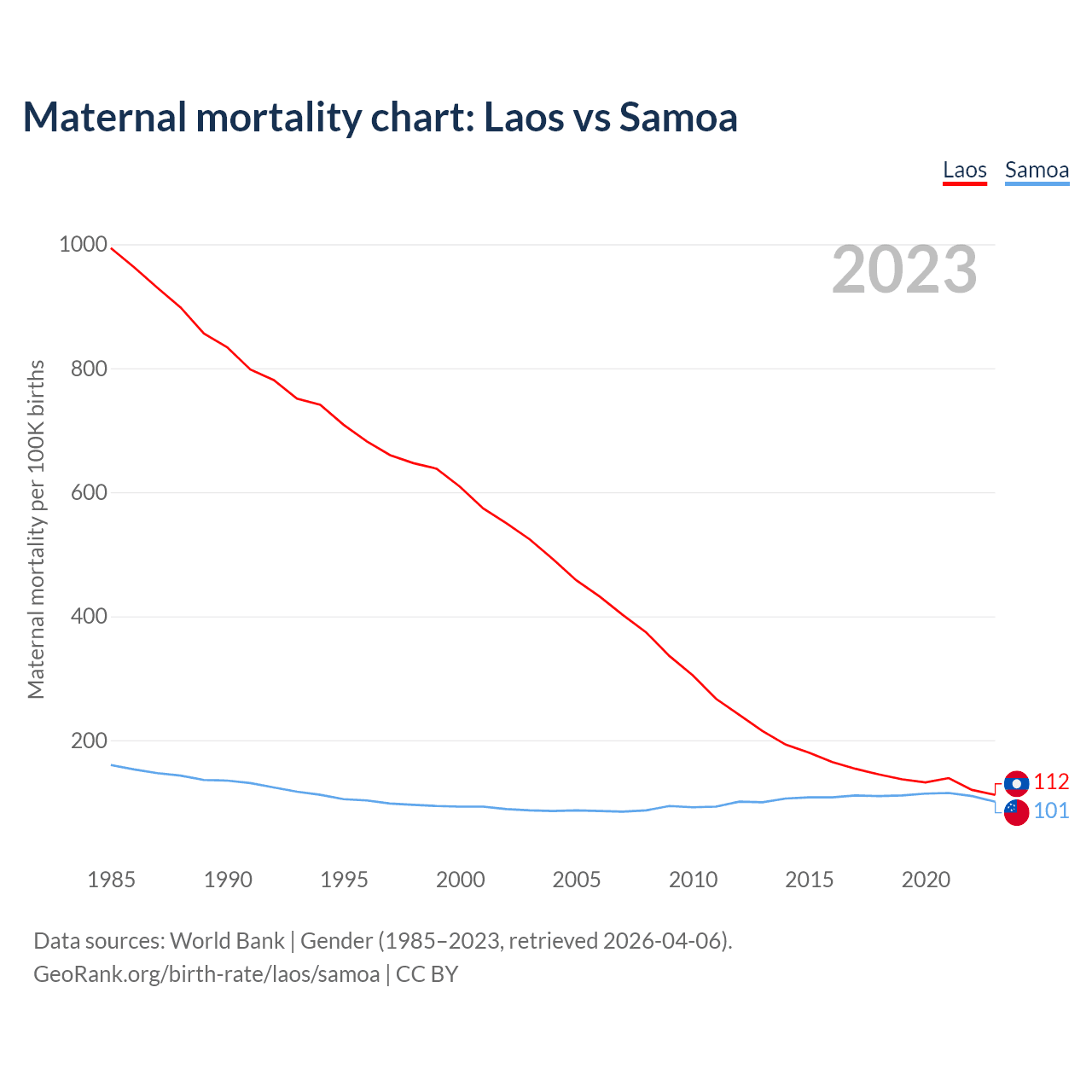 The maternal mortality rate, which is the probability of dying during childbirth or within 42 days of pregnancy termination, is 112 deaths per 100,000 live births in Laos, compared to 101 deaths in Samoa.