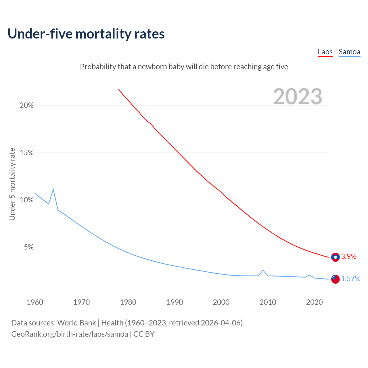 The chance that a newborn baby will die before reaching age five is 3.9% in Laos and 1.57% in Samoa. Above is a chart with historical data on under-five mortality rates.