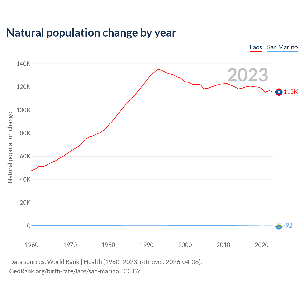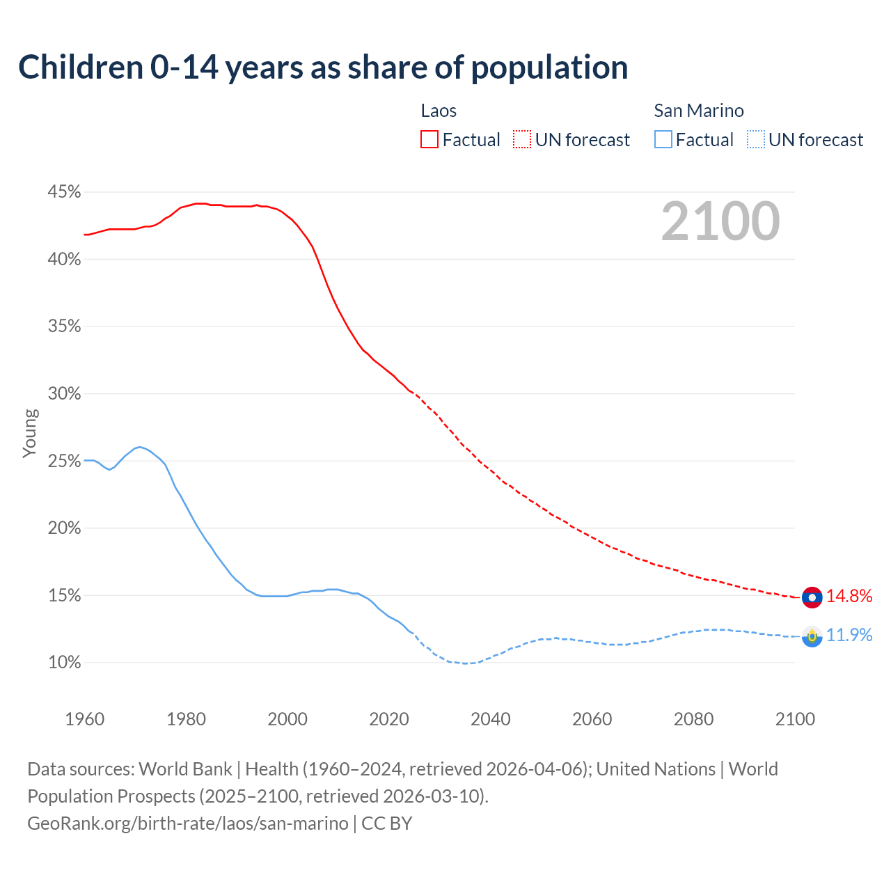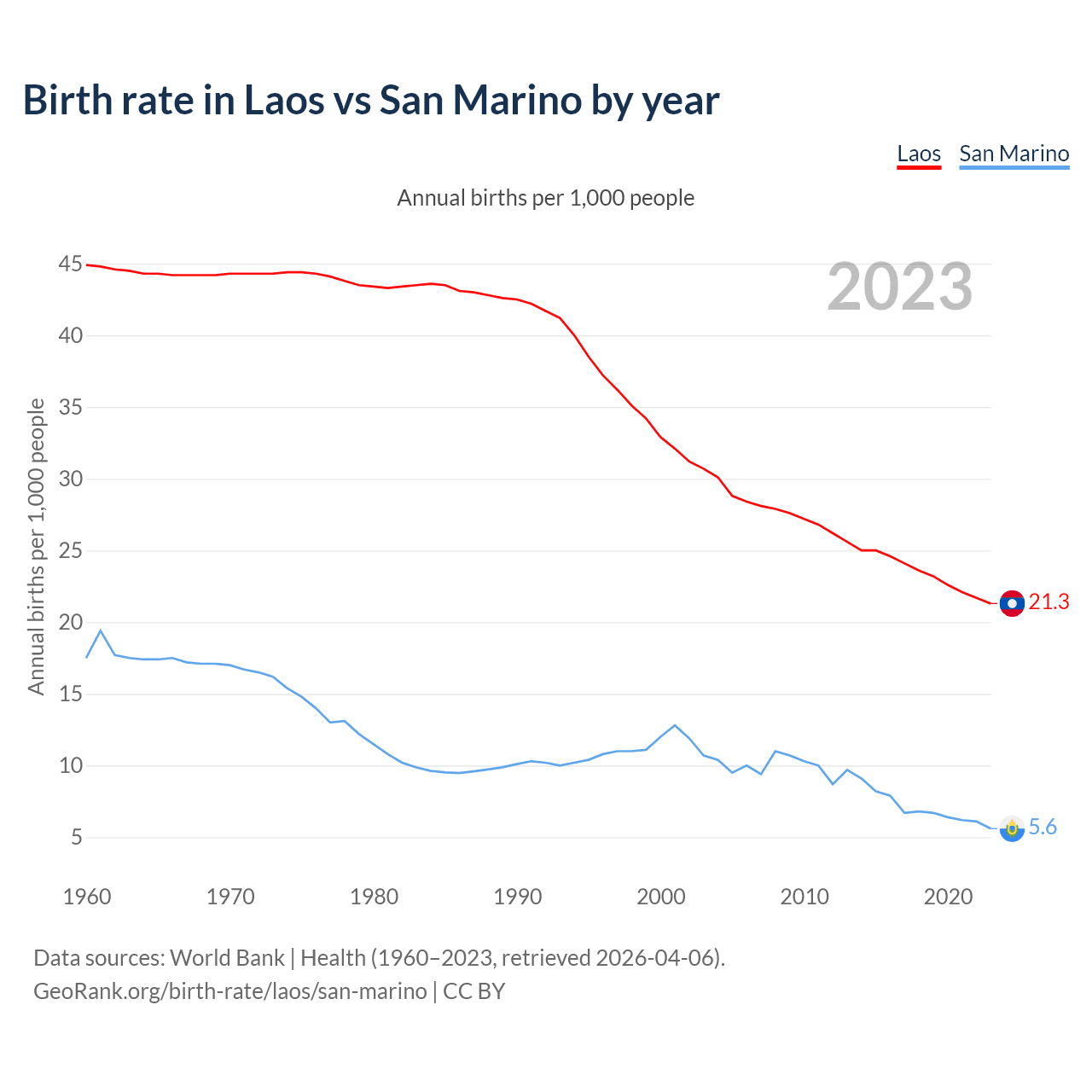According to the latest available data on birth rates, the fertility rate in Laos was 2.42 children per woman in 2023, compared to 1.15 in San Marino in 2023. The replacement level is considered to be 2.1 children per woman.