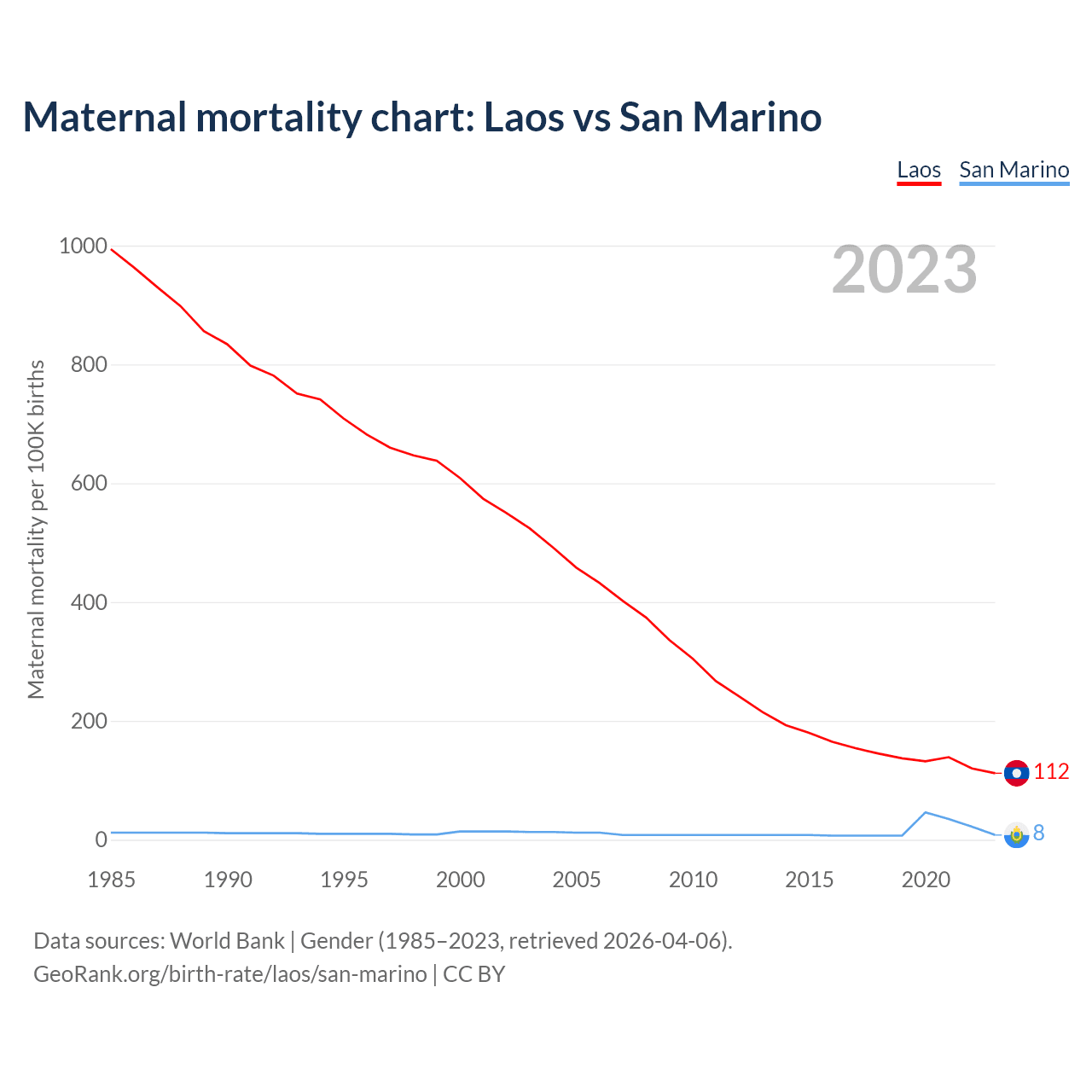The maternal mortality rate, which is the probability of dying during childbirth or within 42 days of pregnancy termination, is 112 deaths per 100,000 live births in Laos, compared to 8 deaths in San Marino.