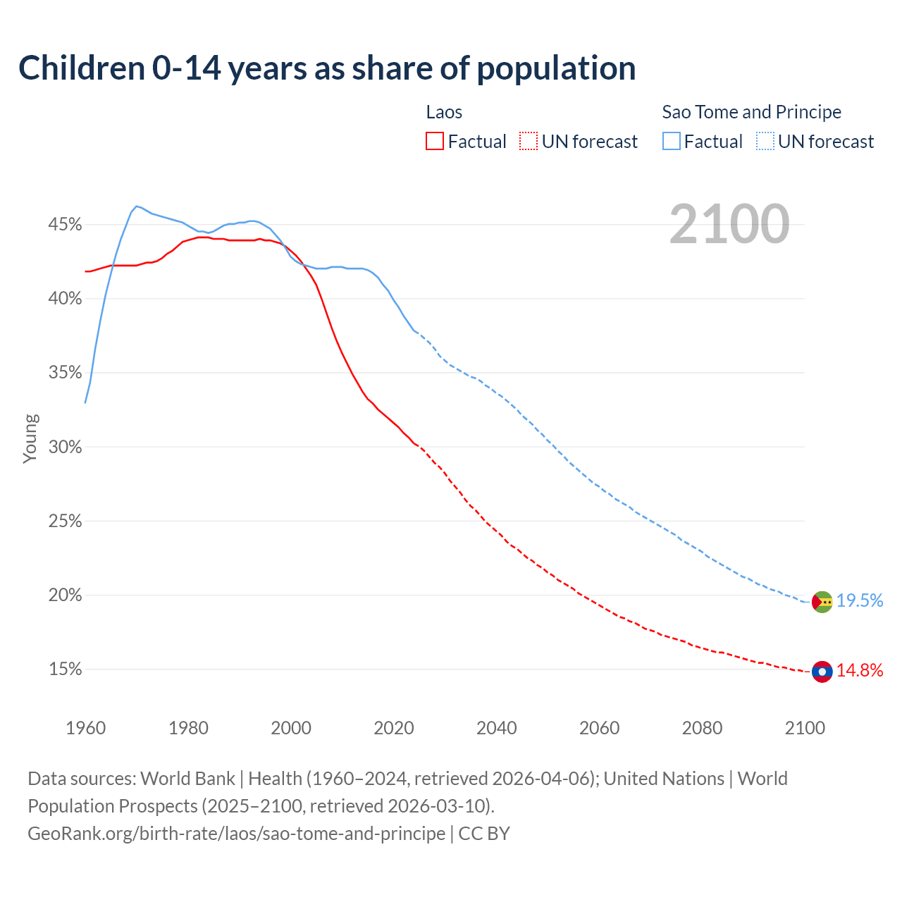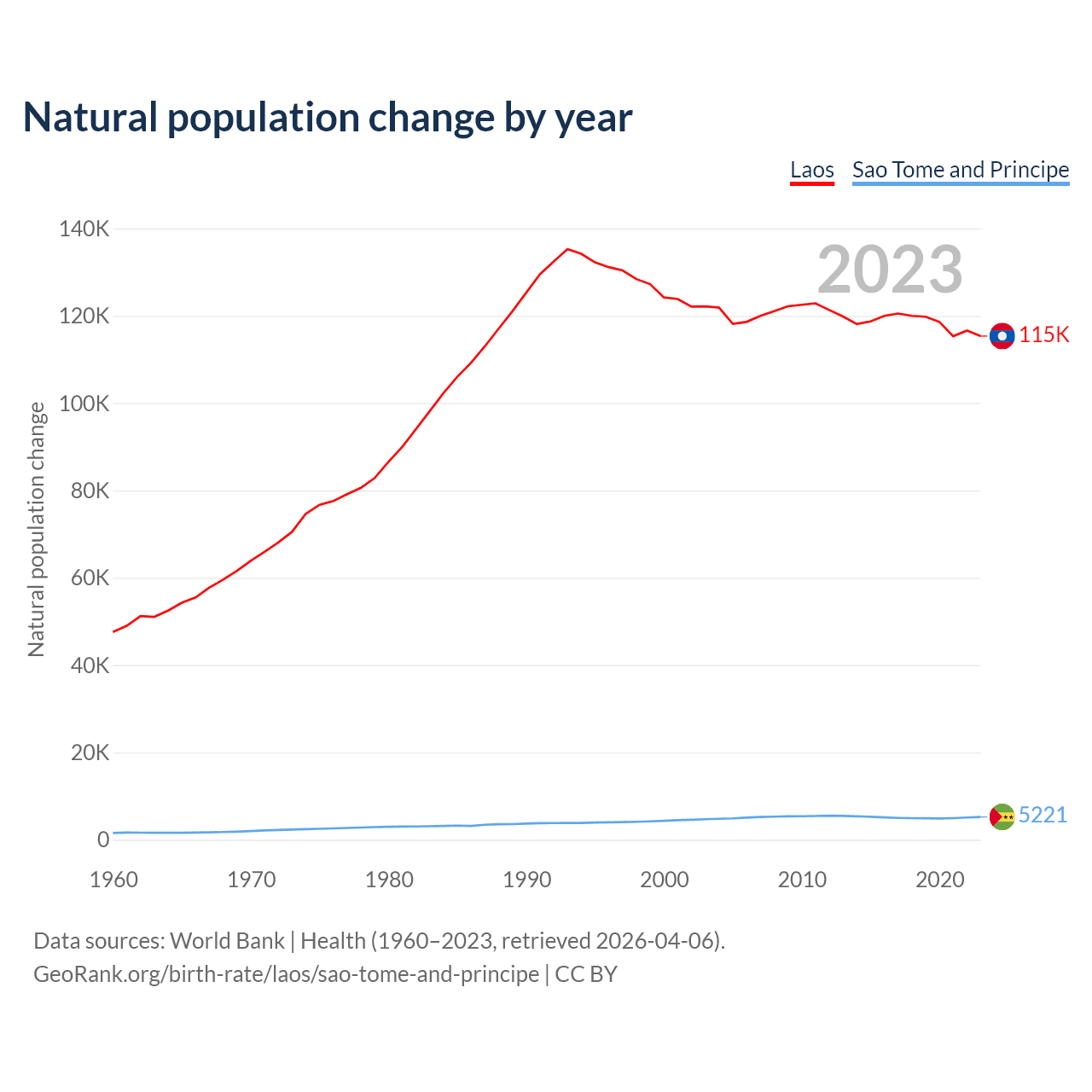 Laos has an annual birth rate of 21.3 births per 1,000 people, compared to 28.2 for Sao Tome and Principe. The average number of children a woman is expected to have during her lifetime — the fertility rate, is 2.42 in Laos and 3.64 in Sao Tome and Principe — 50.5% difference.