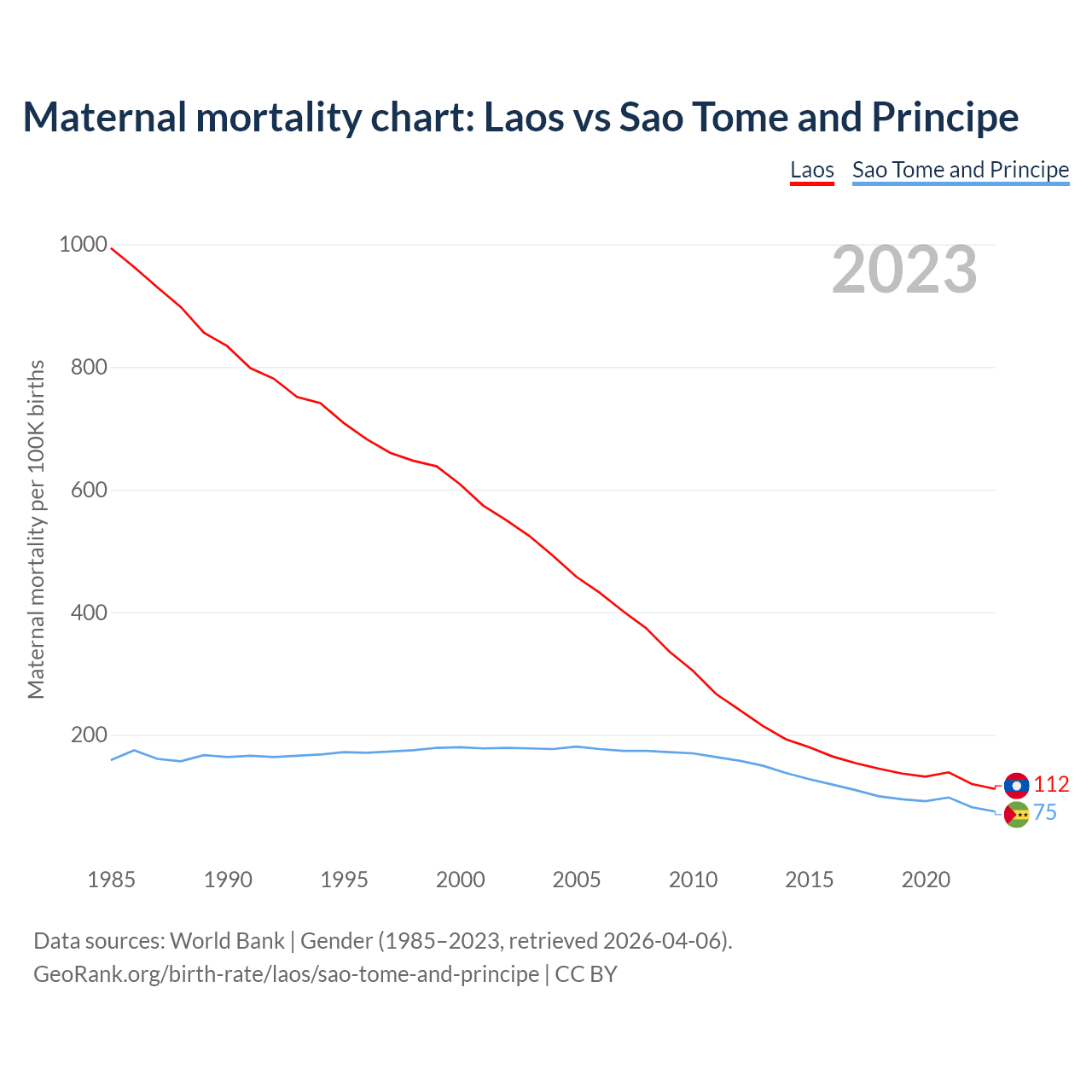 The maternal mortality rate, which is the probability of dying during childbirth or within 42 days of pregnancy termination, is 112 deaths per 100,000 live births in Laos, compared to 75 deaths in Sao Tome and Principe.