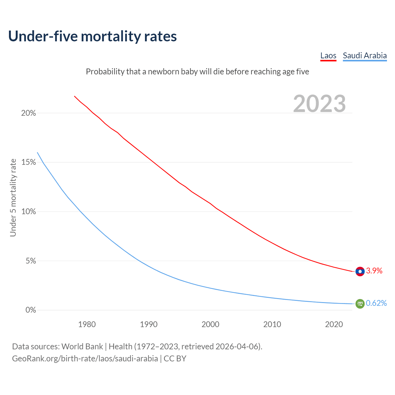 The chance that a newborn baby will die before reaching age five is 3.9% in Laos and 0.62% in Saudi Arabia. Above is a chart with historical data on under-five mortality rates.