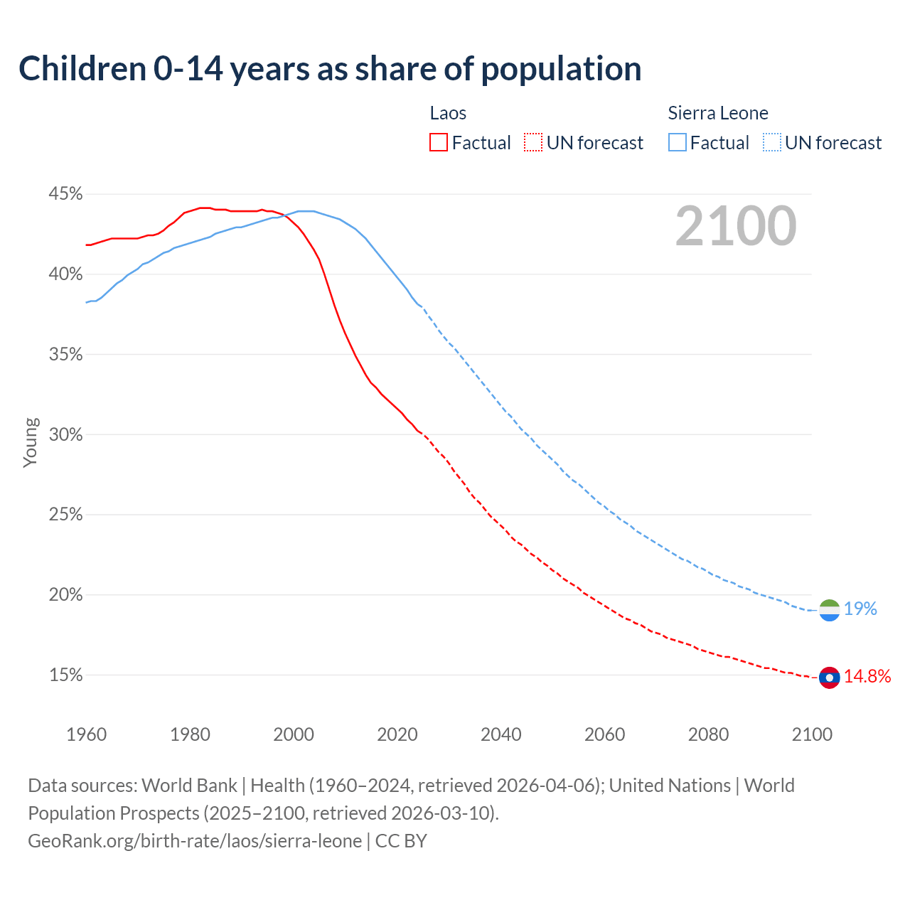 According to the latest available data on birth rates, the fertility rate in Laos was 2.42 children per woman in 2023, compared to 3.79 in Sierra Leone in 2023. The replacement level is considered to be 2.1 children per woman.