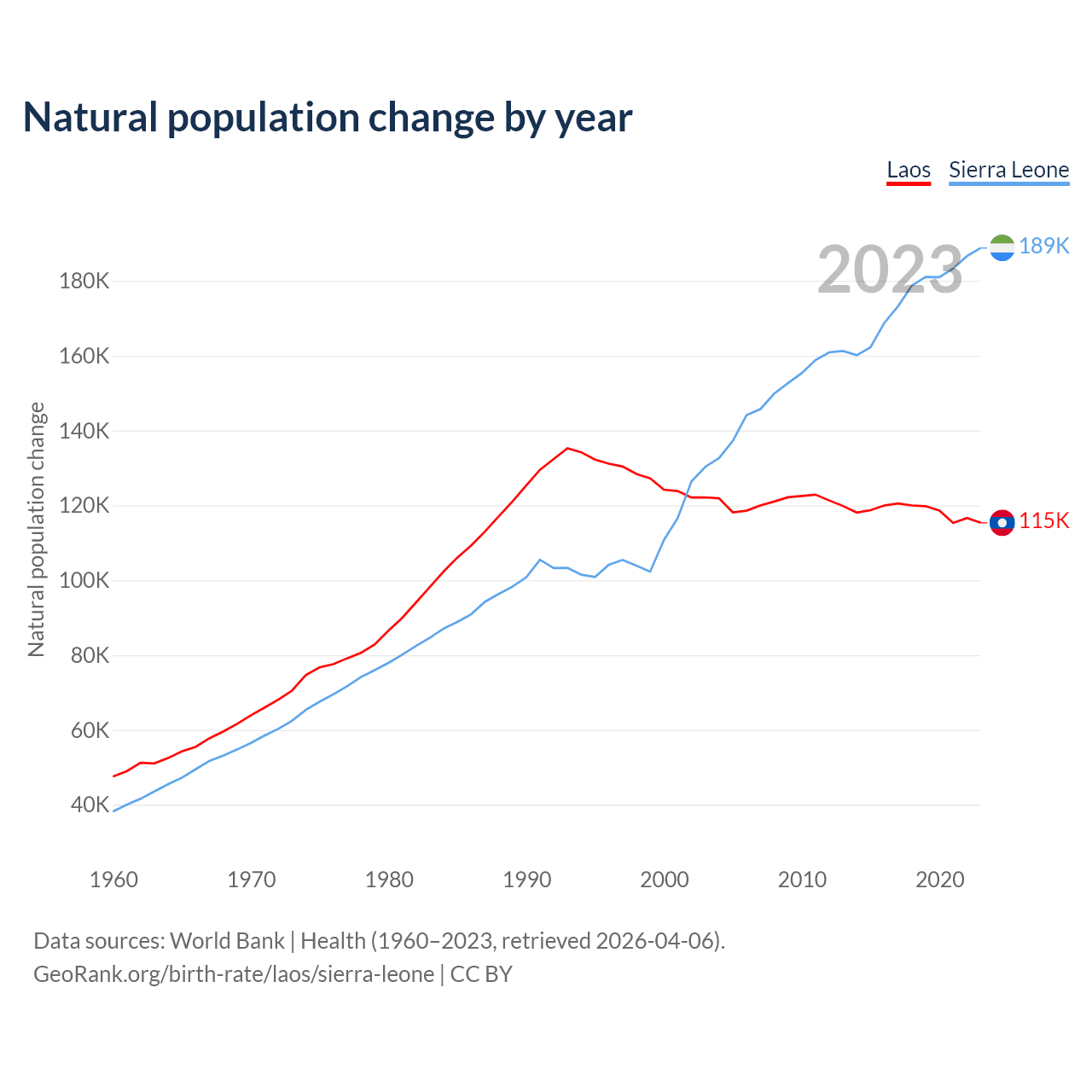 Laos has an annual birth rate of 21.3 births per 1,000 people, compared to 30.6 for Sierra Leone. The average number of children a woman is expected to have during her lifetime — the fertility rate, is 2.42 in Laos and 3.79 in Sierra Leone — 56.6% difference.