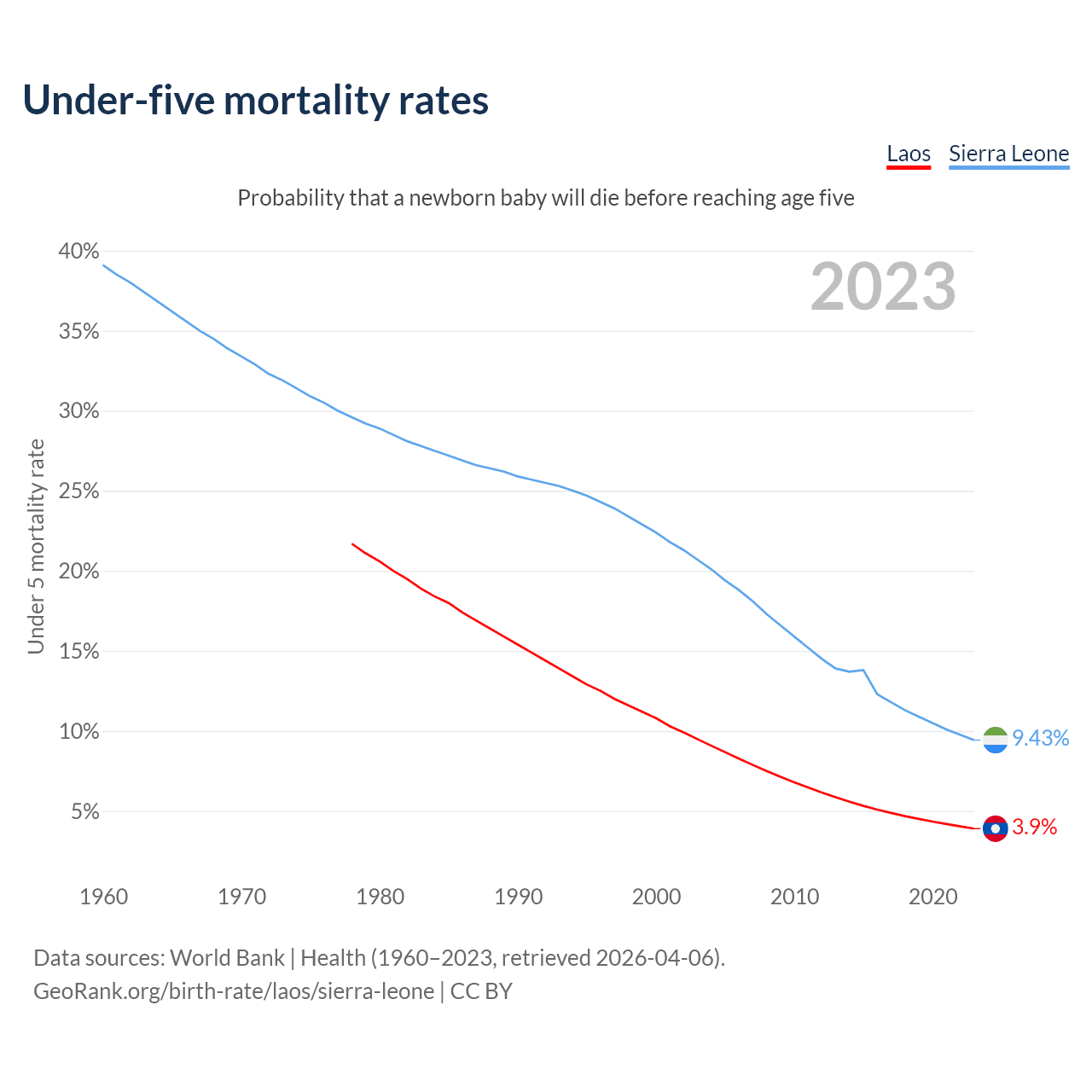 The chance that a newborn baby will die before reaching age five is 3.9% in Laos and 9.43% in Sierra Leone. Above is a chart with historical data on under-five mortality rates.