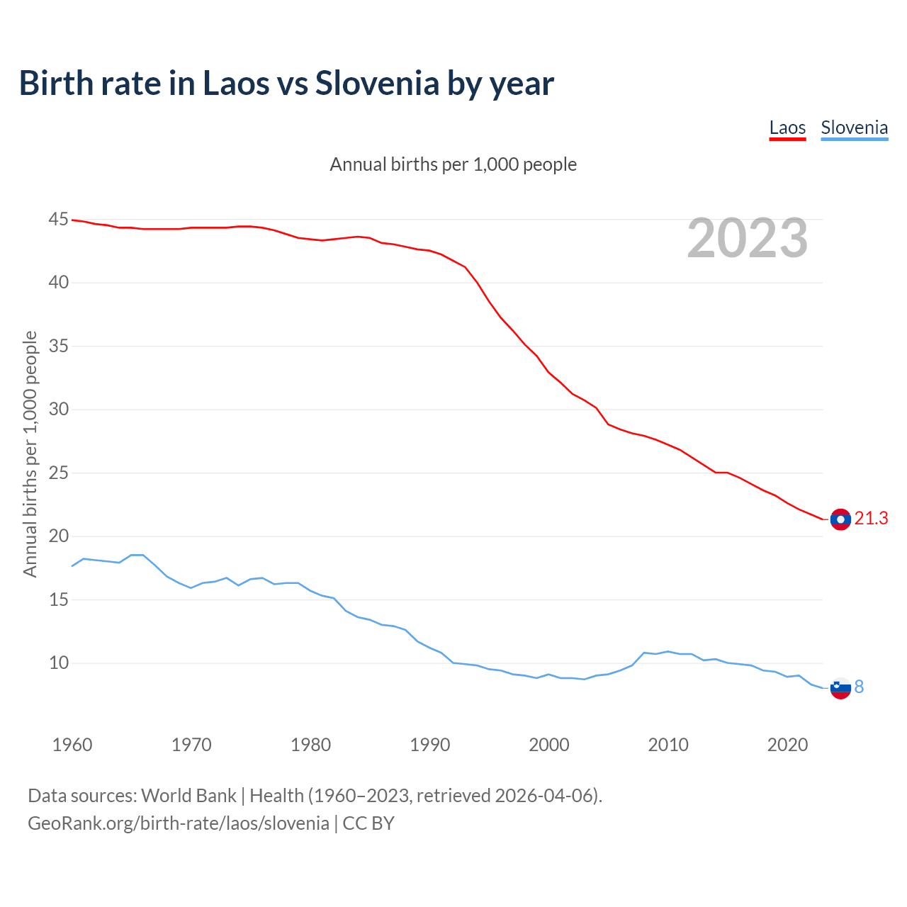 Laos has an annual birth rate of 21.3 births per 1,000 people, compared to 8 for Slovenia. The average number of children a woman is expected to have during her lifetime — the fertility rate, is 2.42 in Laos and 1.51 in Slovenia — 37.6% difference.