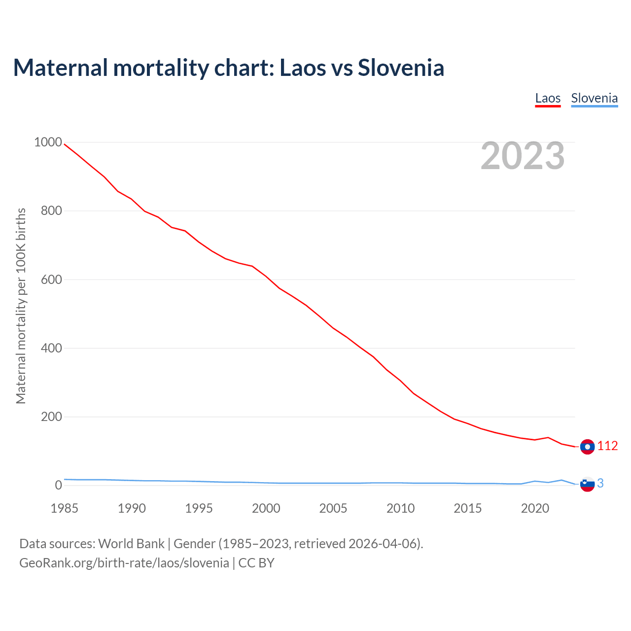 The maternal mortality rate, which is the probability of dying during childbirth or within 42 days of pregnancy termination, is 112 deaths per 100,000 live births in Laos, compared to 3 deaths in Slovenia.