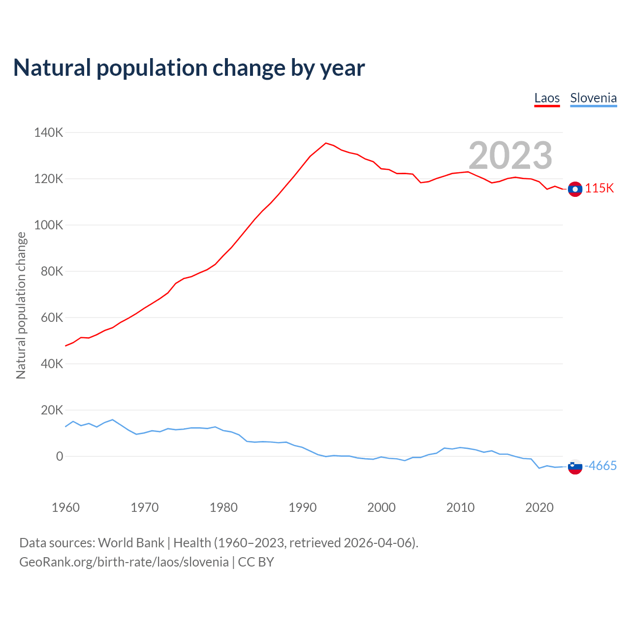 According to the latest available data on birth rates, the fertility rate in Laos was 2.42 children per woman in 2023, compared to 1.51 in Slovenia in 2023. The replacement level is considered to be 2.1 children per woman.