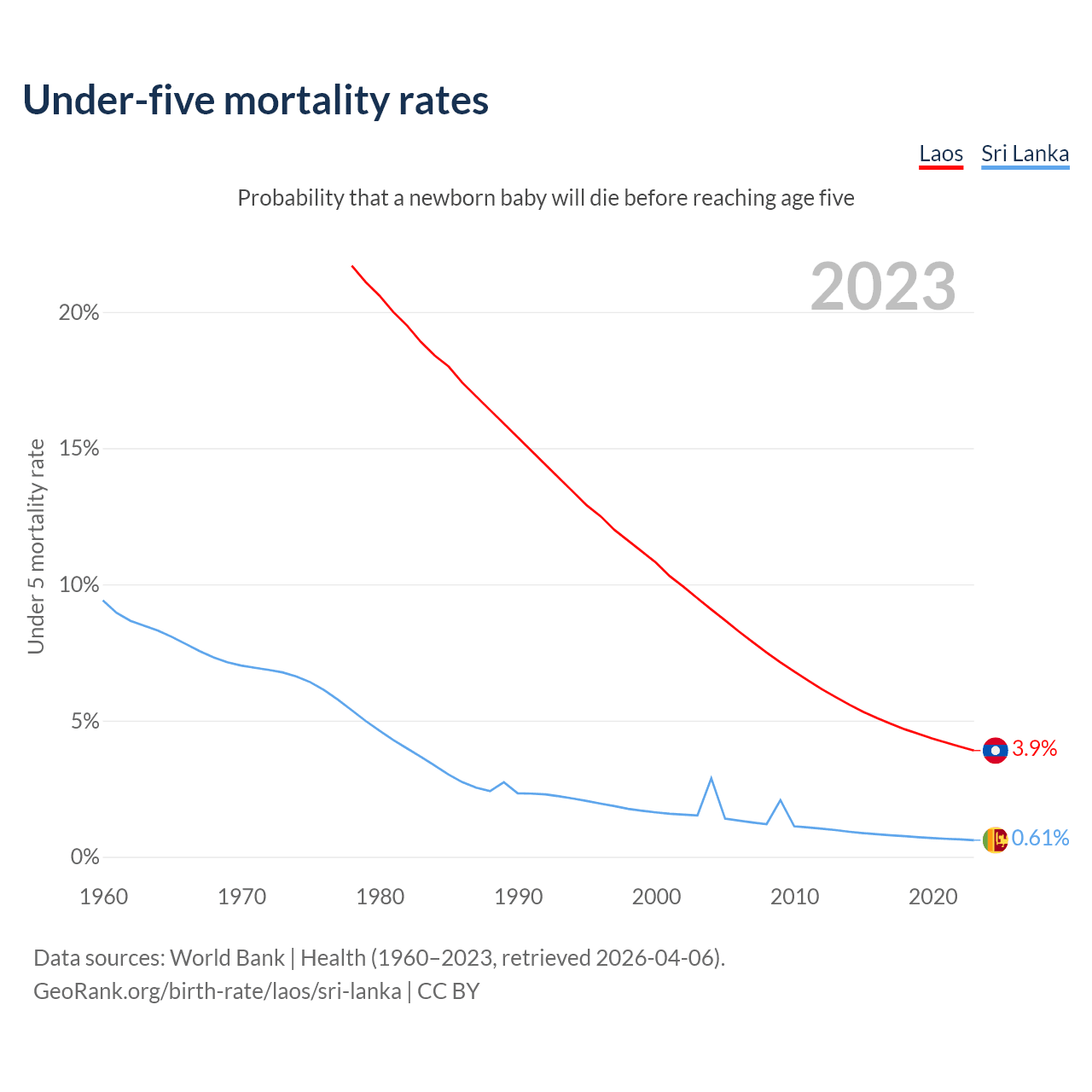The chance that a newborn baby will die before reaching age five is 3.9% in Laos and 0.61% in Sri Lanka. Above is a chart with historical data on under-five mortality rates.