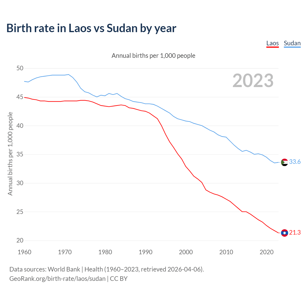 Laos has an annual birth rate of 21.3 births per 1,000 people, compared to 33.6 for Sudan. The average number of children a woman is expected to have during her lifetime — the fertility rate, is 2.42 in Laos and 4.32 in Sudan — 78.6% difference.