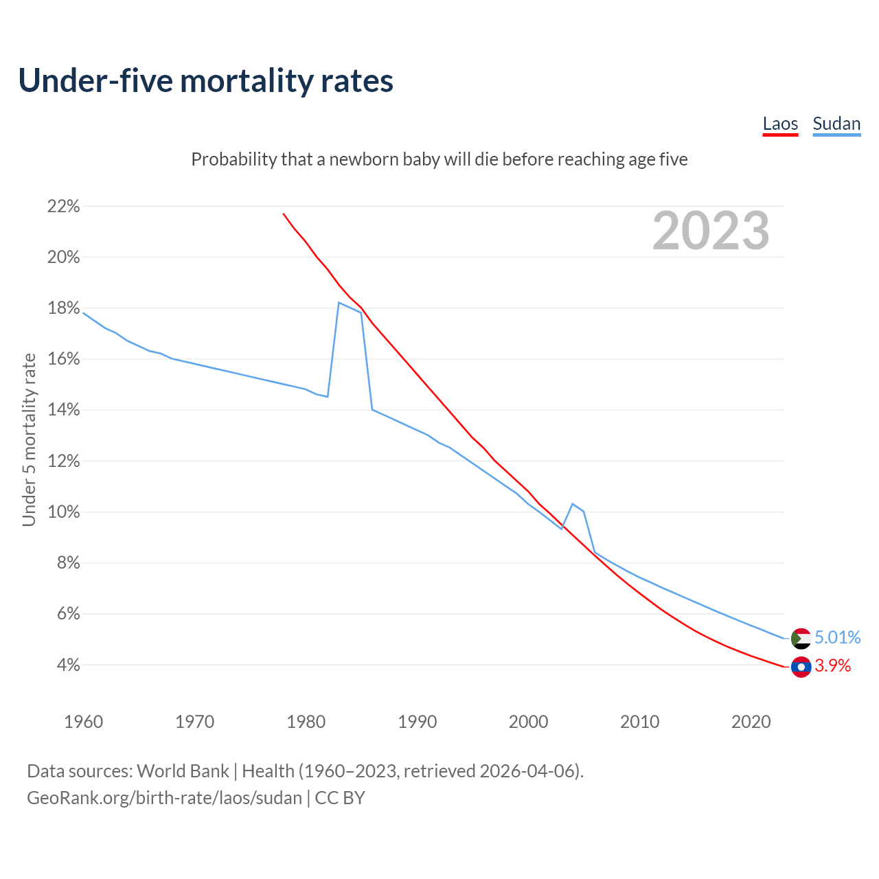 The chance that a newborn baby will die before reaching age five is 3.9% in Laos and 5.01% in Sudan. Above is a chart with historical data on under-five mortality rates.