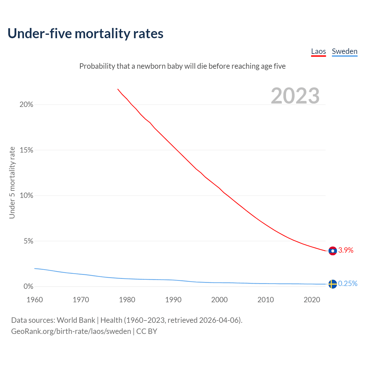 The chance that a newborn baby will die before reaching age five is 3.9% in Laos and 0.25% in Sweden. Above is a chart with historical data on under-five mortality rates.