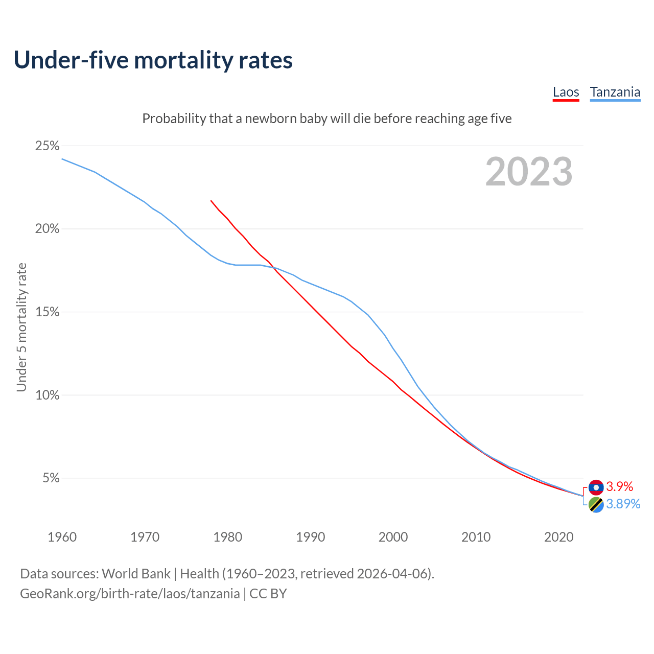 The chance that a newborn baby will die before reaching age five is 3.9% in Laos and 3.89% in Tanzania. Above is a chart with historical data on under-five mortality rates.