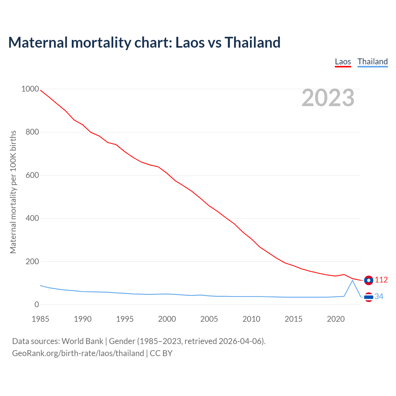 The maternal mortality rate, which is the probability of dying during childbirth or within 42 days of pregnancy termination, is 112 deaths per 100,000 live births in Laos, compared to 34 deaths in Thailand.