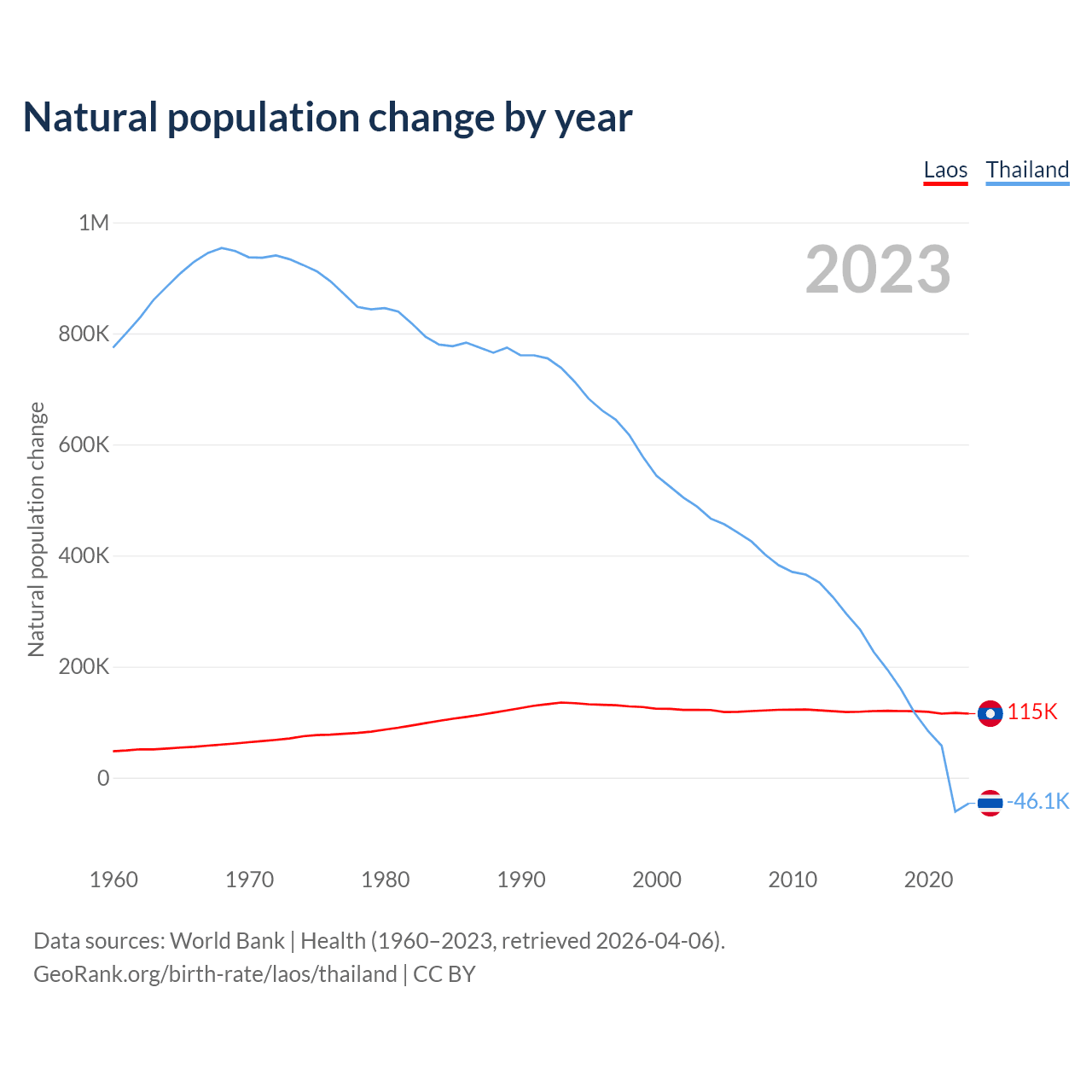 According to the latest available data on birth rates, the fertility rate in Laos was 2.42 children per woman in 2023, compared to 1.21 in Thailand in 2023. The replacement level is considered to be 2.1 children per woman.