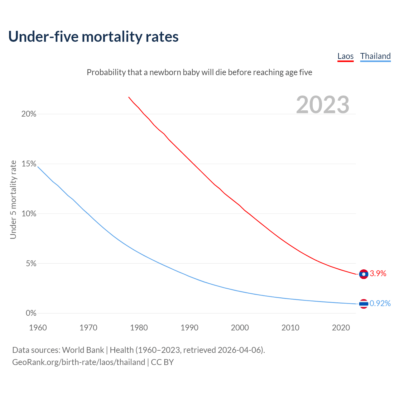 The chance that a newborn baby will die before reaching age five is 3.9% in Laos and 0.92% in Thailand. Above is a chart with historical data on under-five mortality rates.