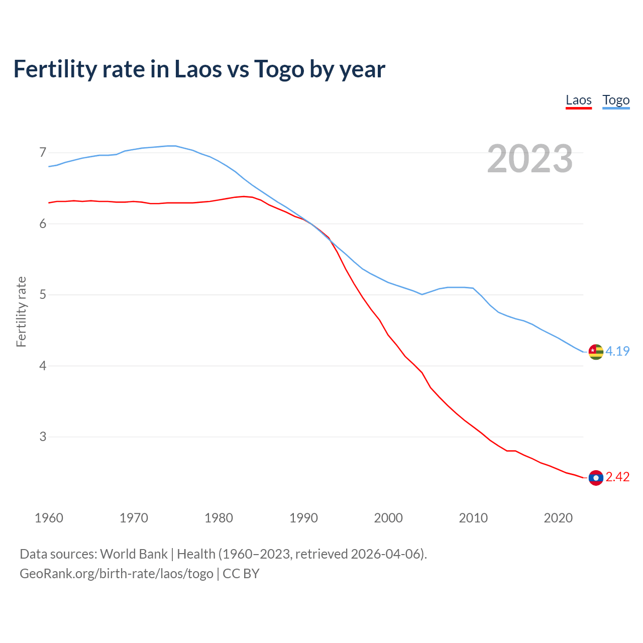 According to the latest available data on birth rates, the fertility rate in Laos was 2.42 children per woman in 2023, compared to 4.19 in Togo in 2023. The replacement level is considered to be 2.1 children per woman.
