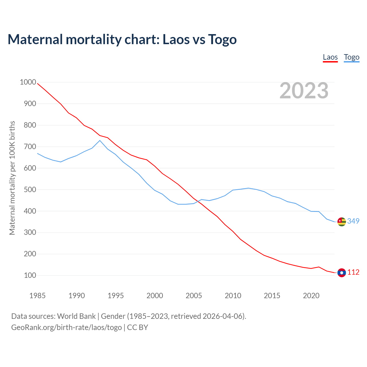 The maternal mortality rate, which is the probability of dying during childbirth or within 42 days of pregnancy termination, is 112 deaths per 100,000 live births in Laos, compared to 349 deaths in Togo.