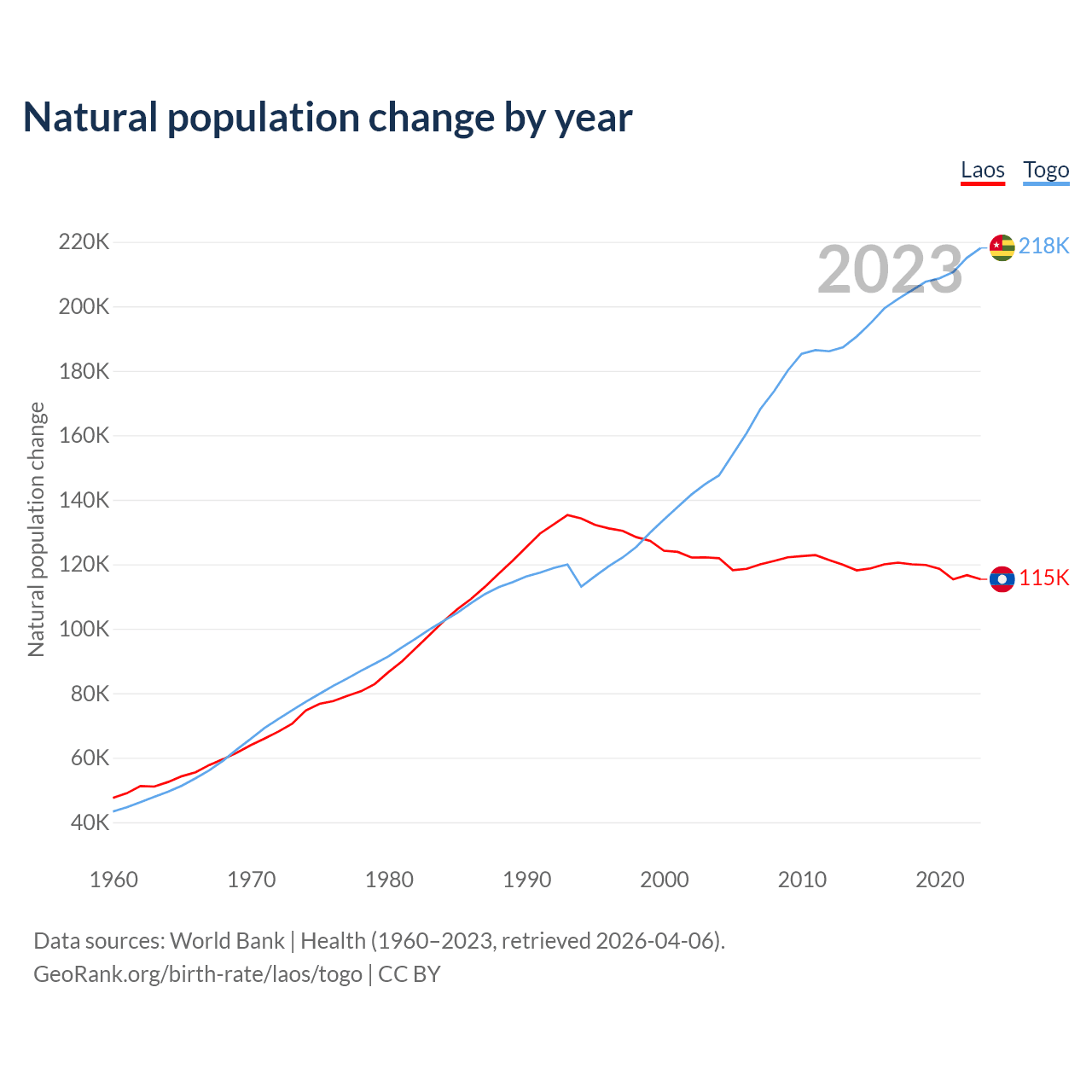 - Laos is ranked 65/196 by birth rate compared to 26/196 for Togo.