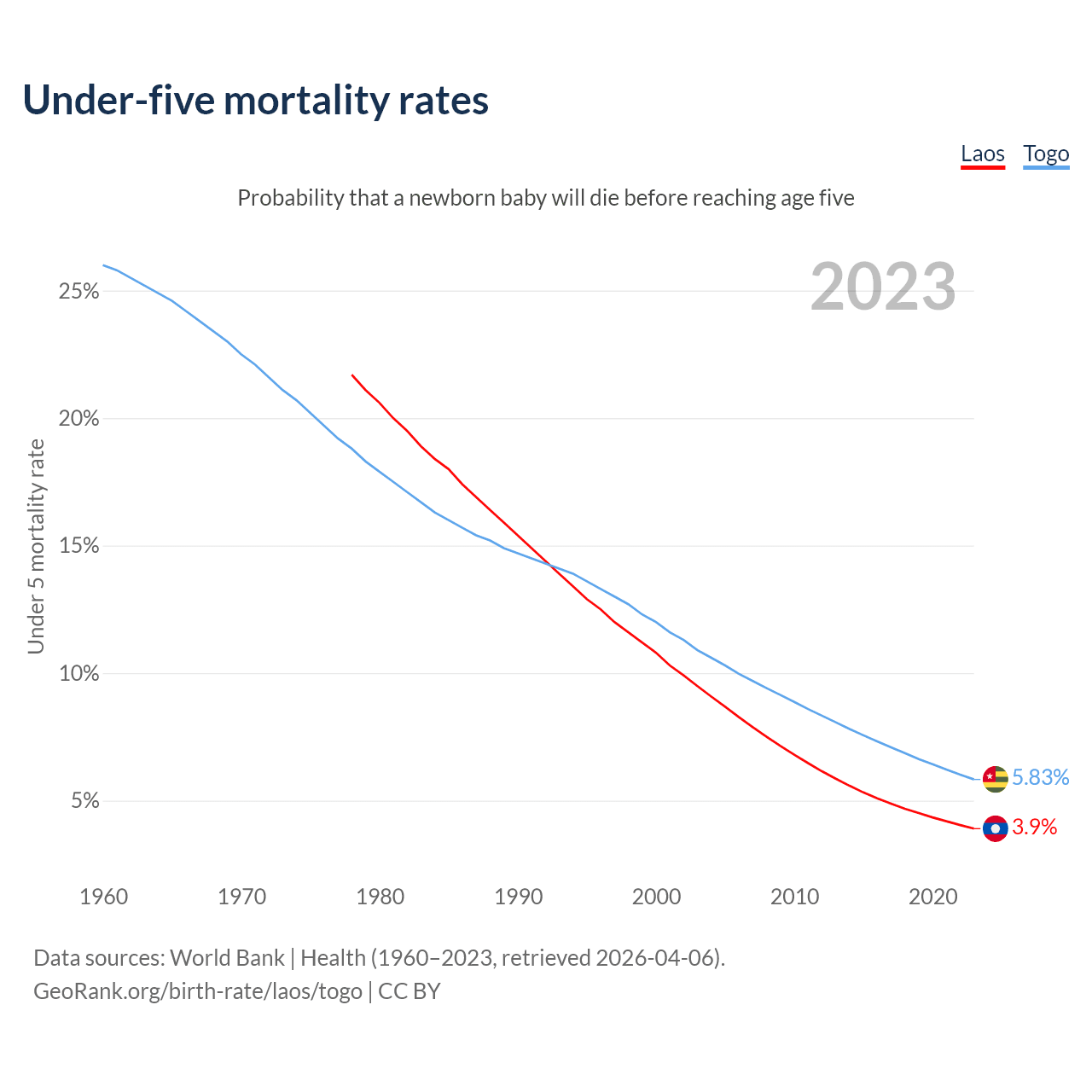 The chance that a newborn baby will die before reaching age five is 3.9% in Laos and 5.83% in Togo. Above is a chart with historical data on under-five mortality rates.