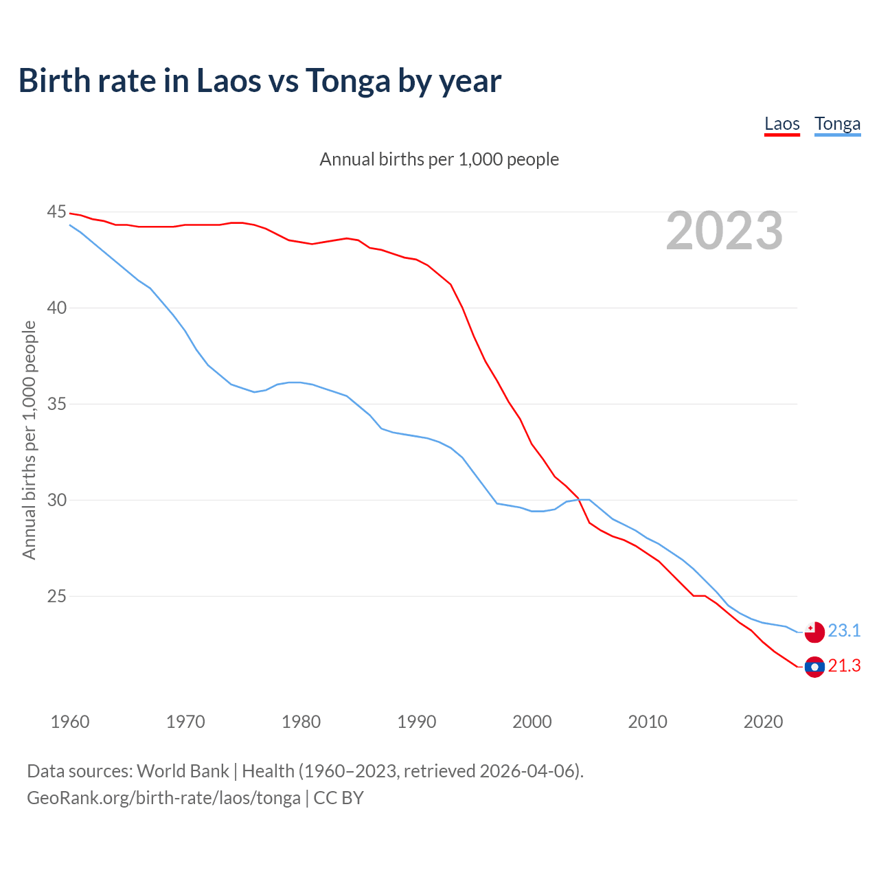 Laos has an annual birth rate of 21.3 births per 1,000 people, compared to 23.1 for Tonga. The average number of children a woman is expected to have during her lifetime — the fertility rate, is 2.42 in Laos and 3.13 in Tonga — 29.2% difference.
