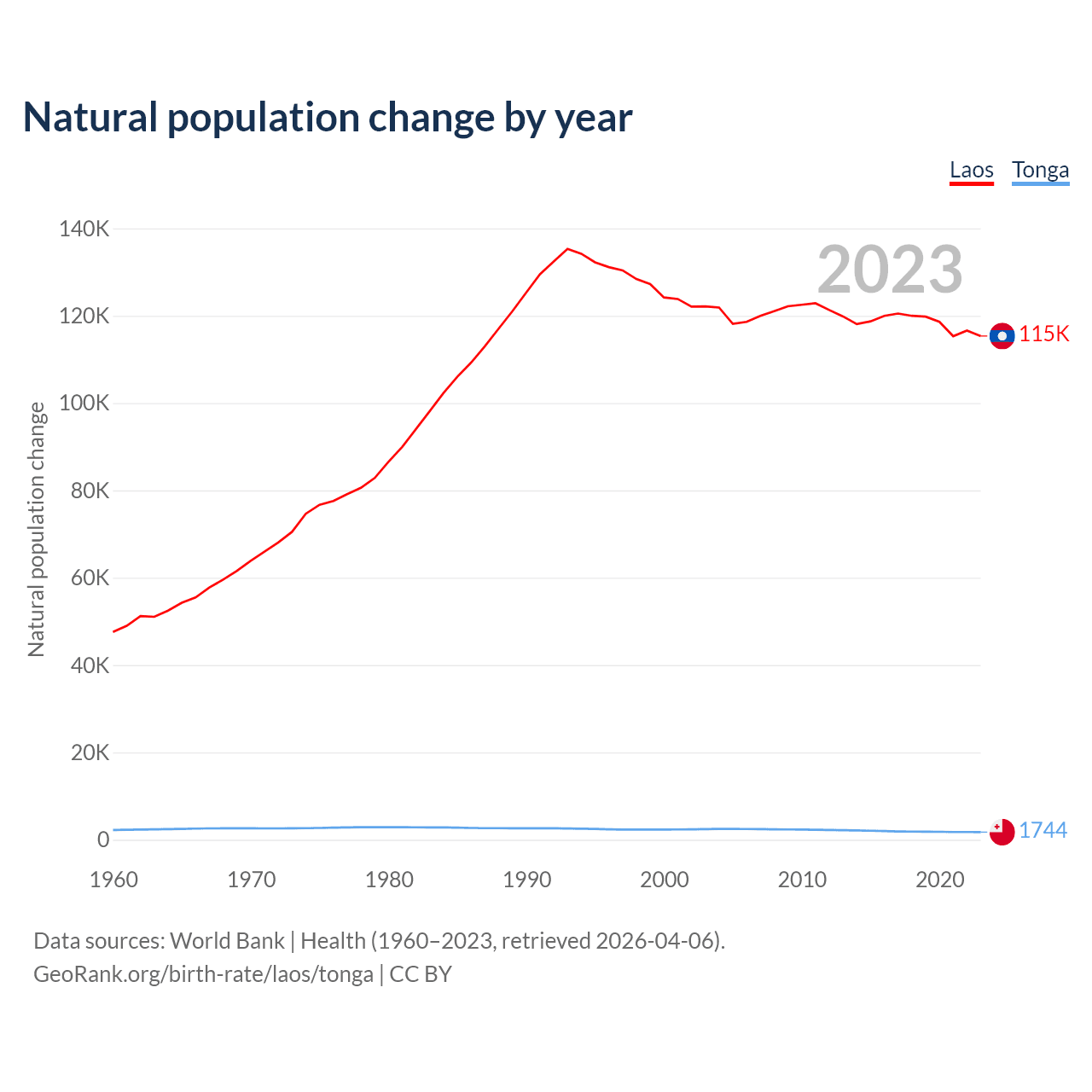 According to the latest available data on birth rates, the fertility rate in Laos was 2.42 children per woman in 2023, compared to 3.13 in Tonga in 2023. The replacement level is considered to be 2.1 children per woman.