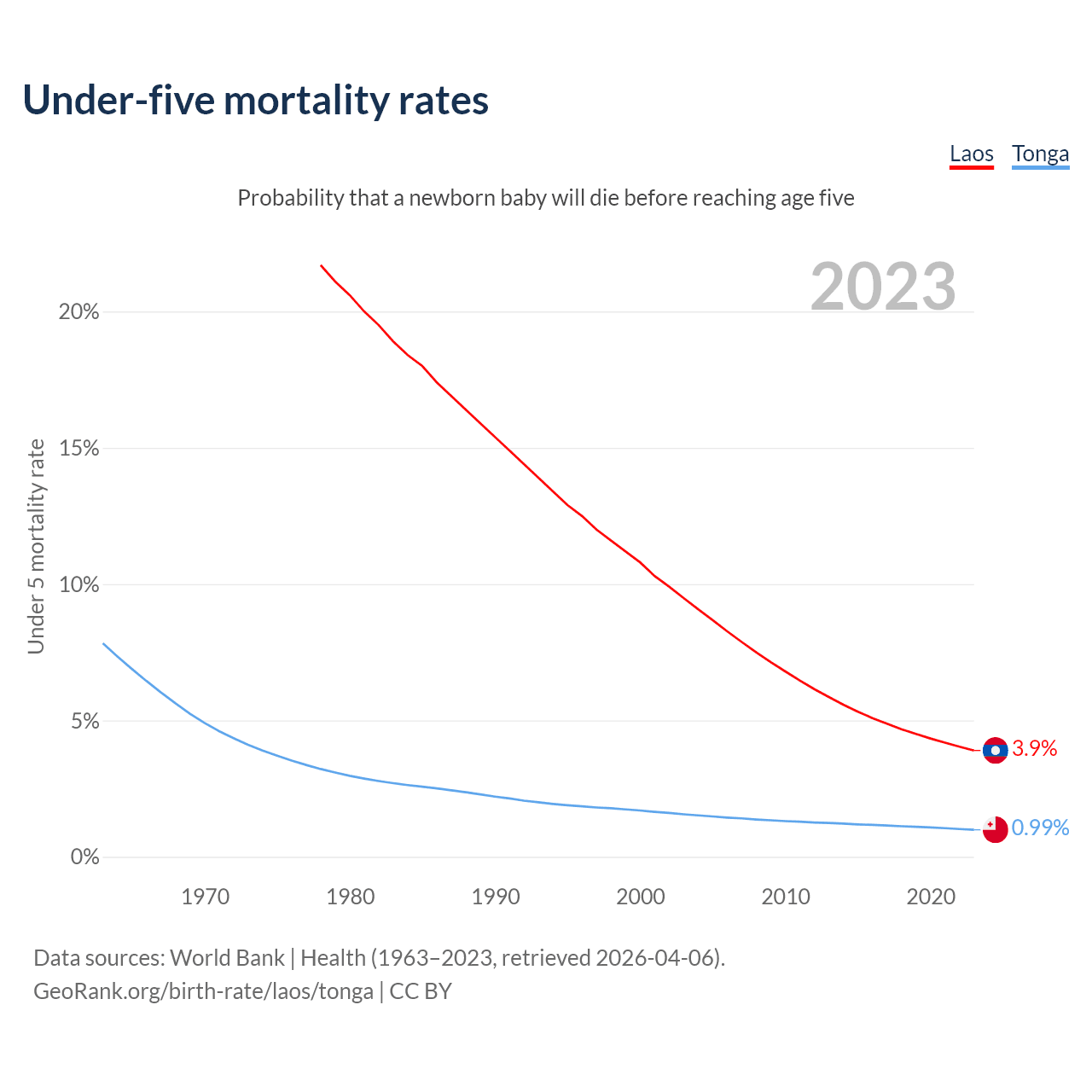 The chance that a newborn baby will die before reaching age five is 3.9% in Laos and 0.99% in Tonga. Above is a chart with historical data on under-five mortality rates.