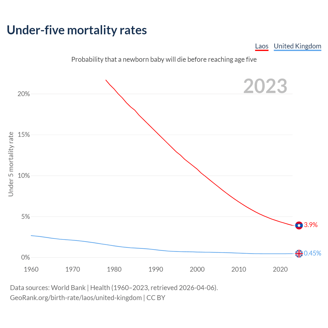 The chance that a newborn baby will die before reaching age five is 3.9% in Laos and 0.45% in the United Kingdom. Above is a chart with historical data on under-five mortality rates.