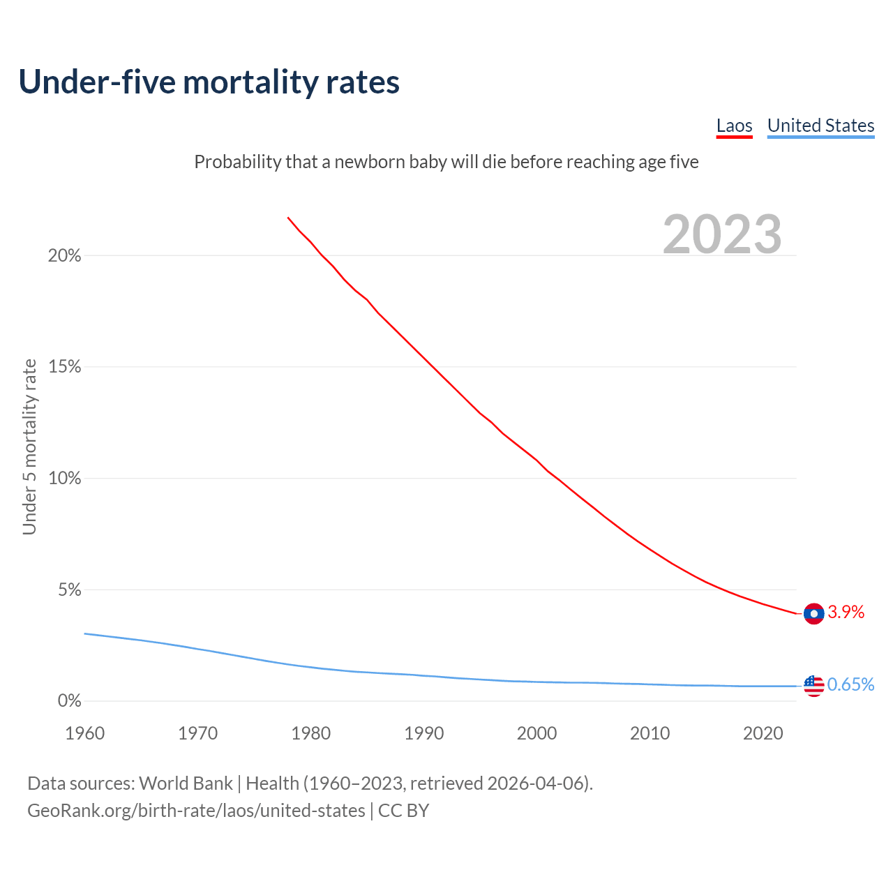 The chance that a newborn baby will die before reaching age five is 3.9% in Laos and 0.65% in the United States. Above is a chart with historical data on under-five mortality rates.