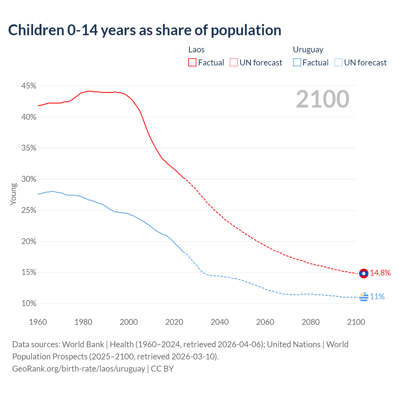 According to the latest available data on birth rates, the fertility rate in Laos was 2.42 children per woman in 2023, compared to 1.41 in Uruguay in 2023. The replacement level is considered to be 2.1 children per woman.