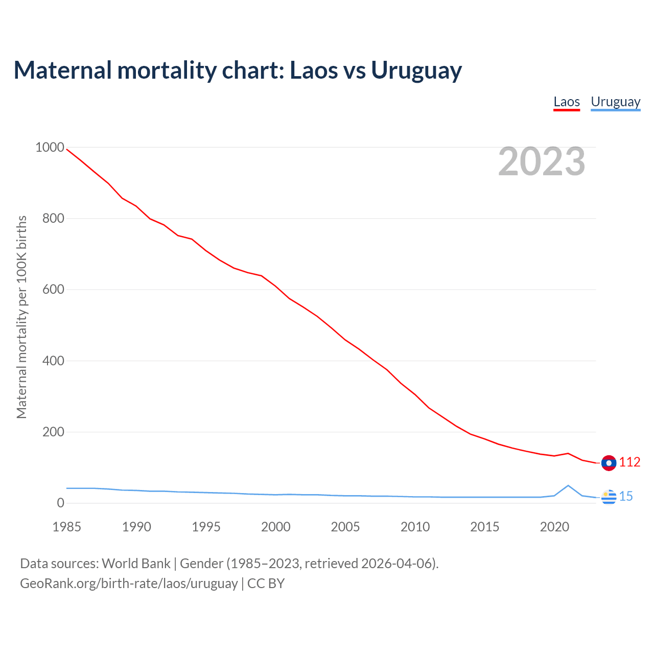 The maternal mortality rate, which is the probability of dying during childbirth or within 42 days of pregnancy termination, is 112 deaths per 100,000 live births in Laos, compared to 15 deaths in Uruguay.