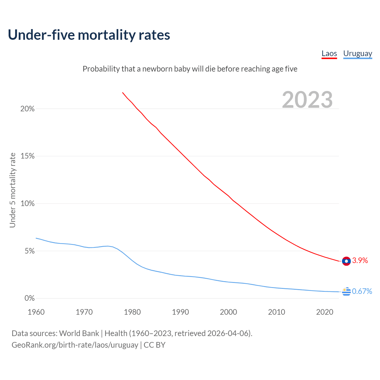 The chance that a newborn baby will die before reaching age five is 3.9% in Laos and 0.67% in Uruguay. Above is a chart with historical data on under-five mortality rates.