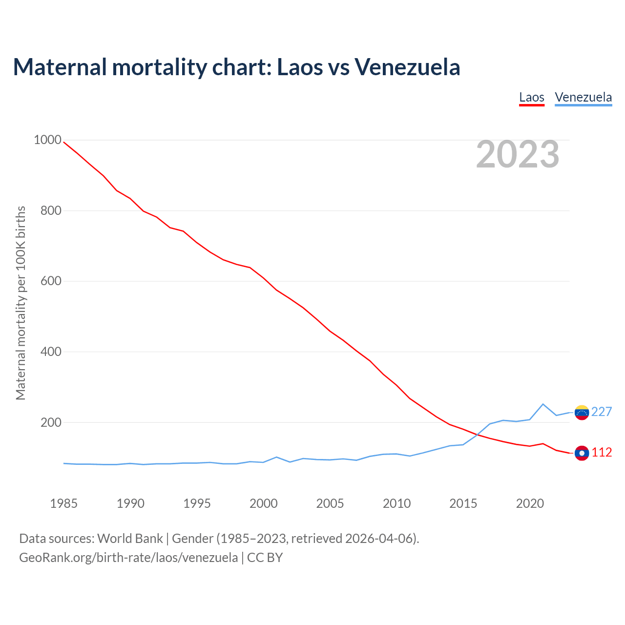 The maternal mortality rate, which is the probability of dying during childbirth or within 42 days of pregnancy termination, is 112 deaths per 100,000 live births in Laos, compared to 227 deaths in Venezuela.