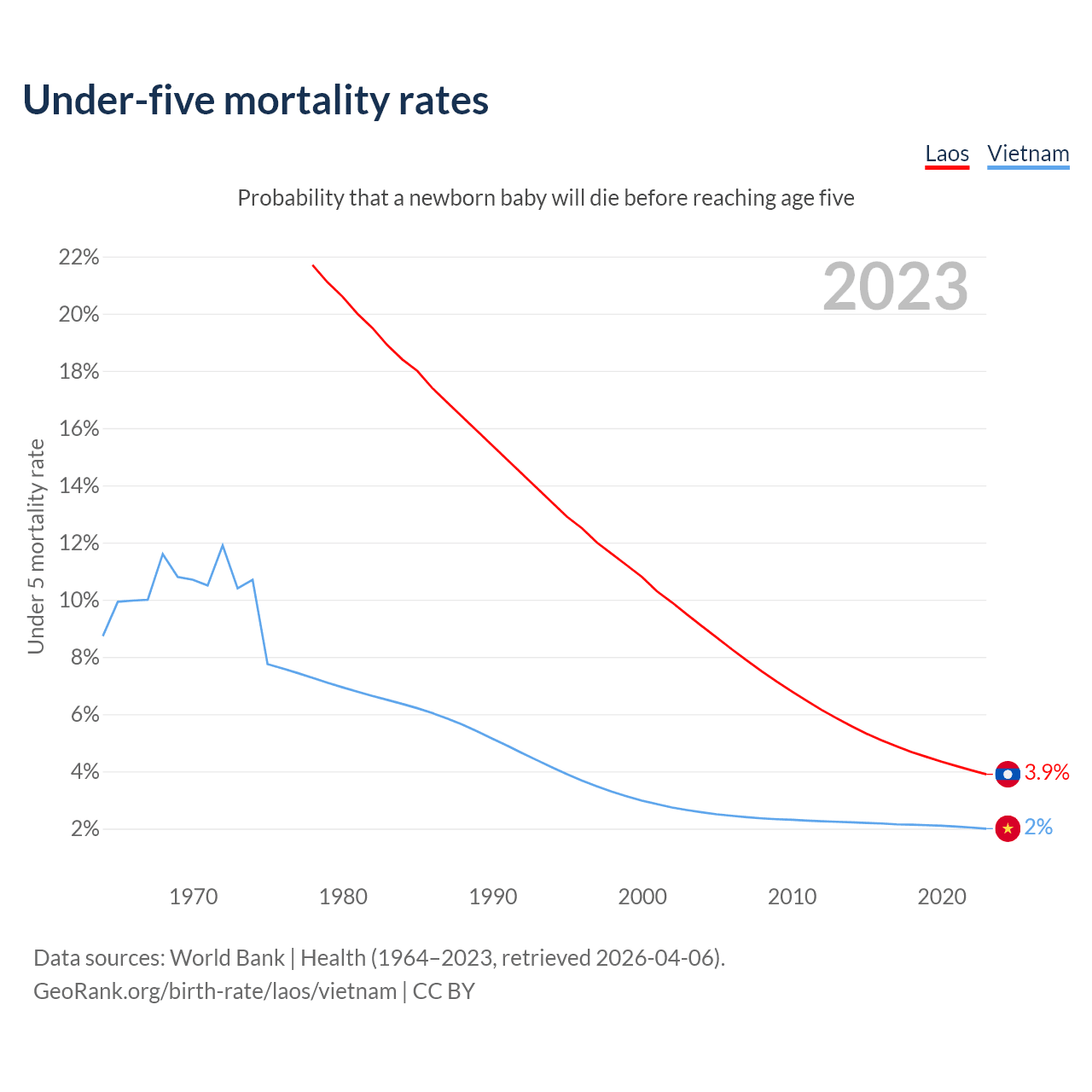 The chance that a newborn baby will die before reaching age five is 3.9% in Laos and 2% in Vietnam. Above is a chart with historical data on under-five mortality rates.