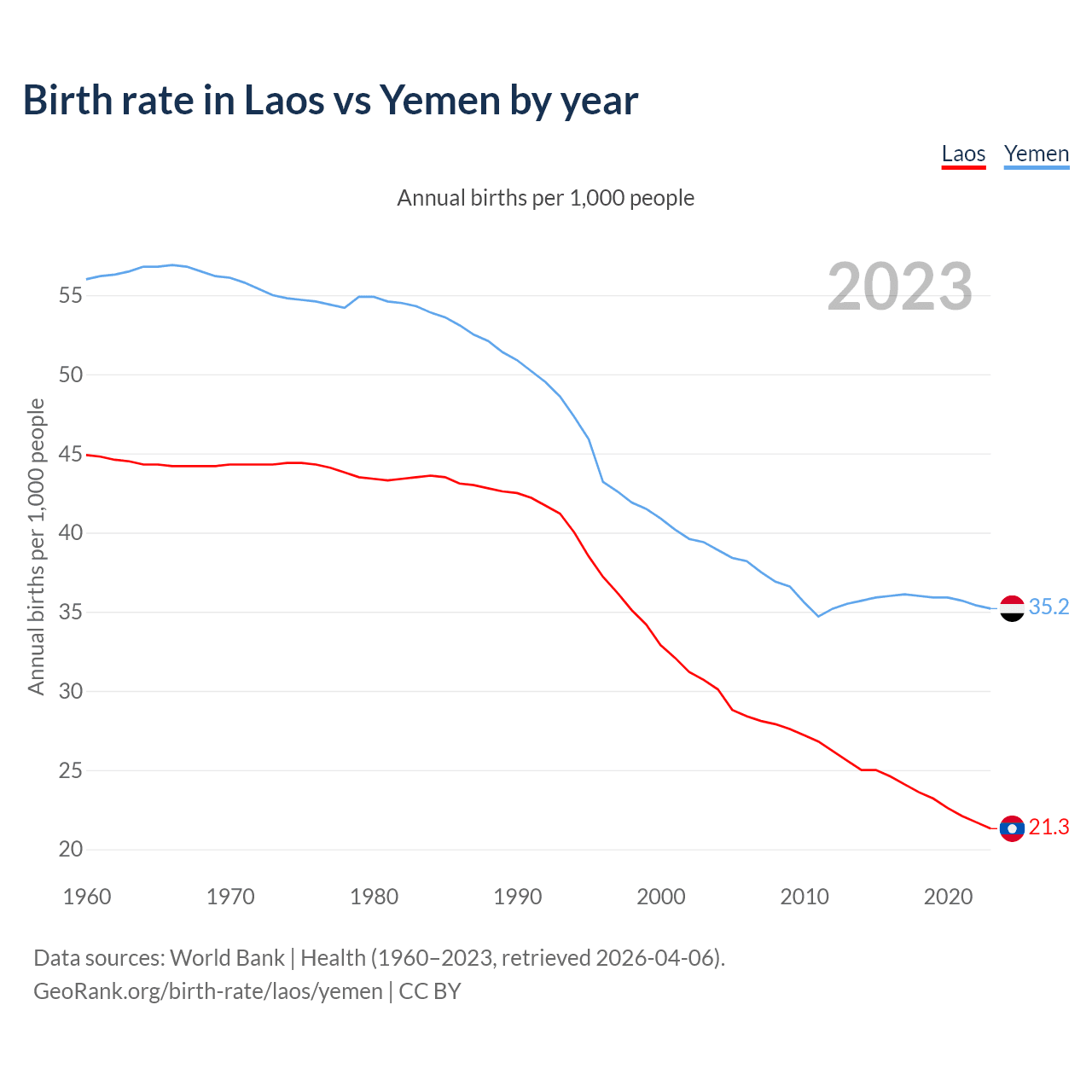 Laos has an annual birth rate of 21.3 births per 1,000 people, compared to 35.2 for Yemen. The average number of children a woman is expected to have during her lifetime — the fertility rate, is 2.42 in Laos and 4.59 in Yemen — 89.6% difference.