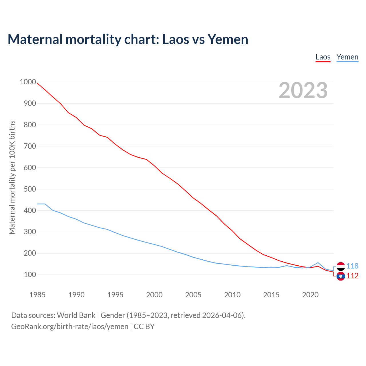The maternal mortality rate, which is the probability of dying during childbirth or within 42 days of pregnancy termination, is 112 deaths per 100,000 live births in Laos, compared to 118 deaths in Yemen.