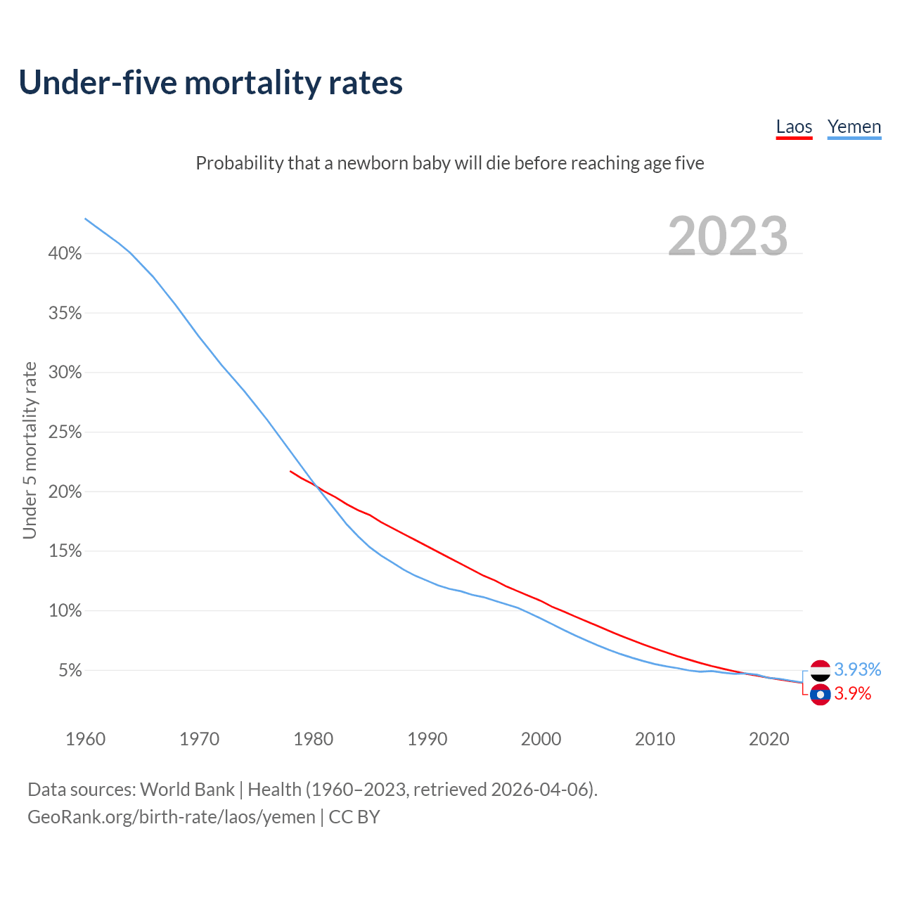 The chance that a newborn baby will die before reaching age five is 3.9% in Laos and 3.93% in Yemen. Above is a chart with historical data on under-five mortality rates.