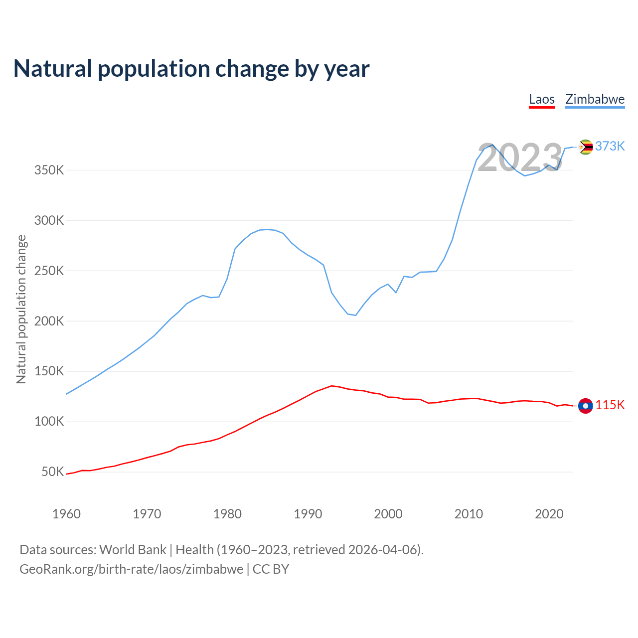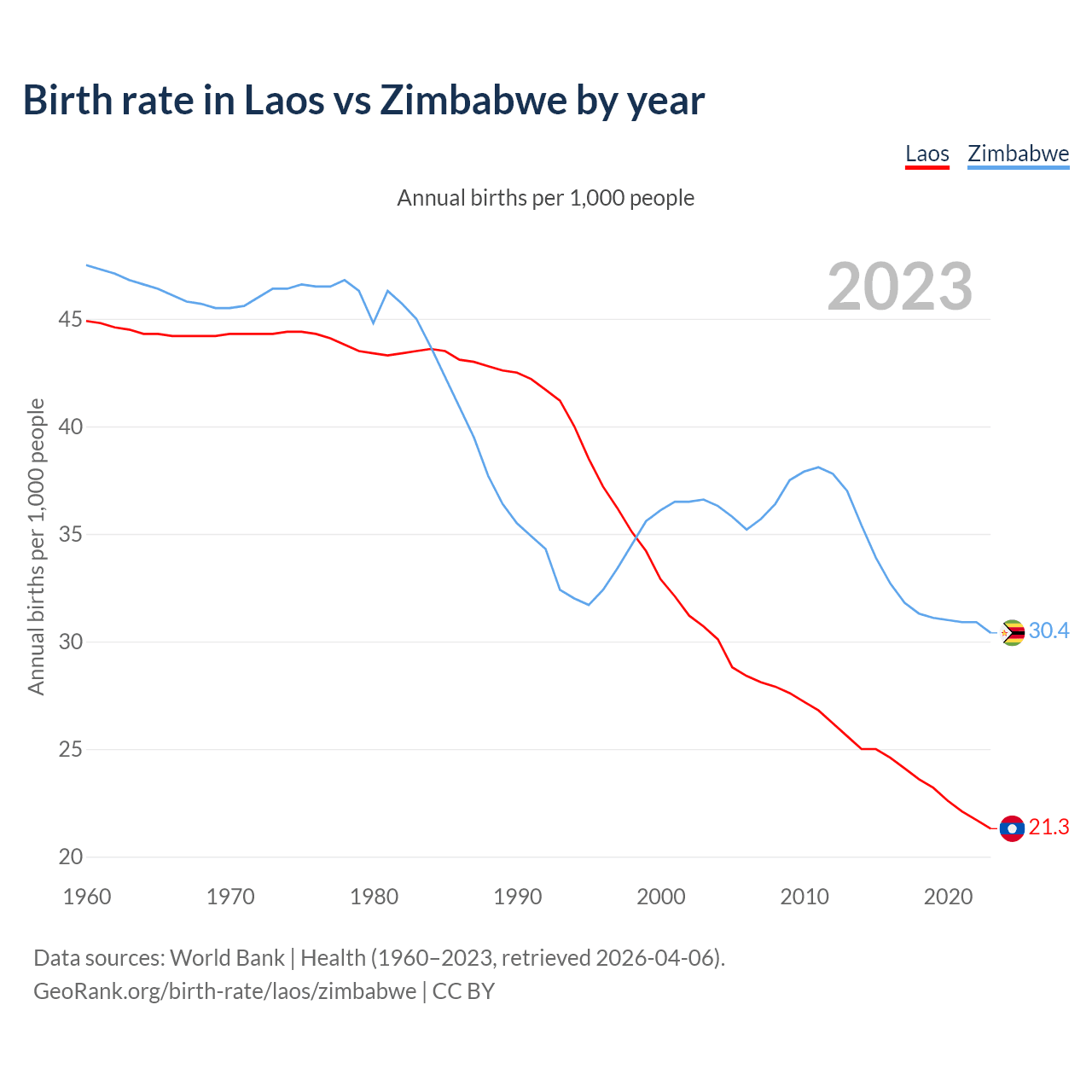 Laos has an annual birth rate of 21.3 births per 1,000 people, compared to 30.4 for Zimbabwe. The average number of children a woman is expected to have during her lifetime — the fertility rate, is 2.42 in Laos and 3.72 in Zimbabwe — 53.8% difference.